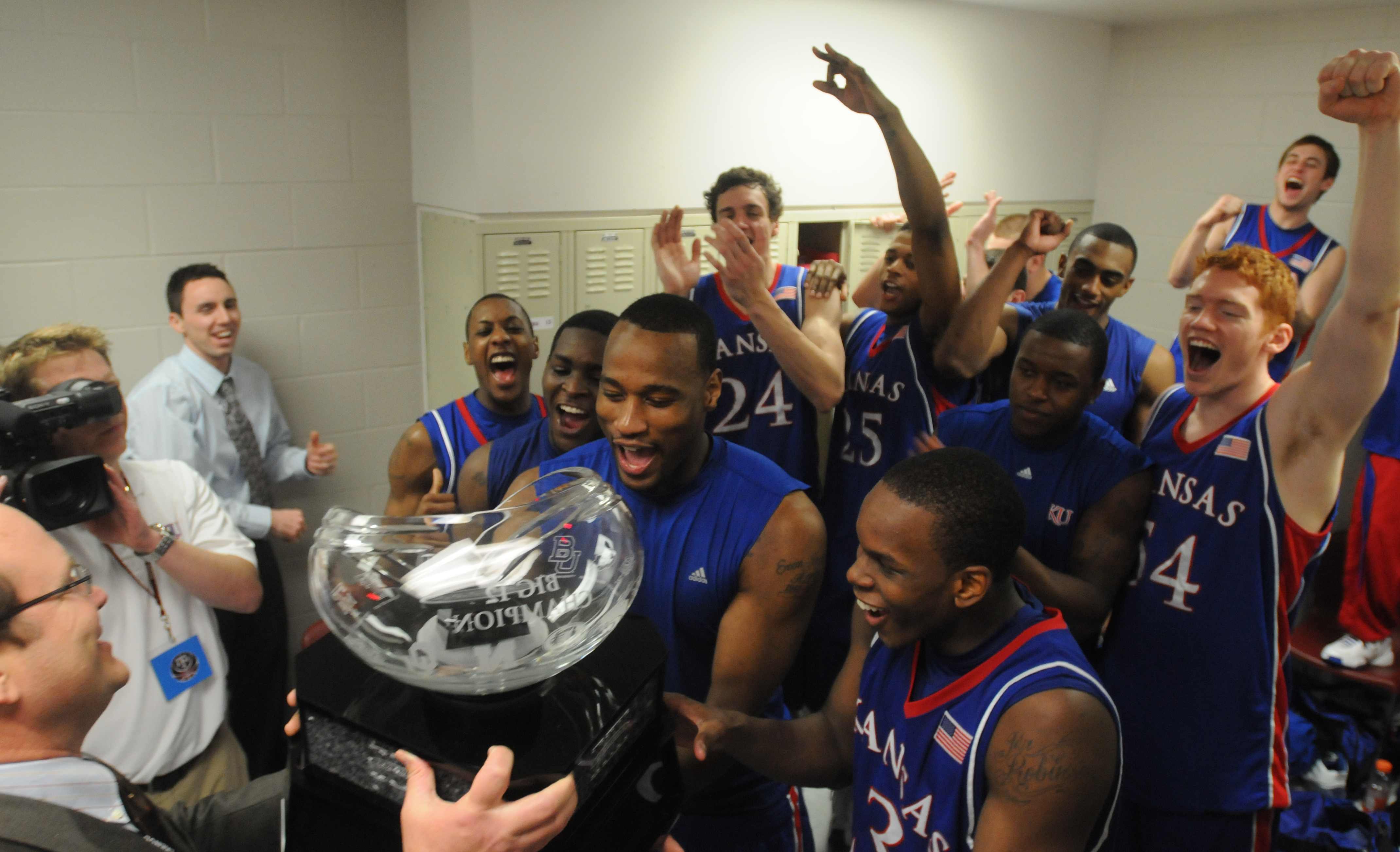 • The Jayhawks celebrated their 72-55 win at Texas A&M by being presented with the Big 12 championship trophy in the visitors locker room. Darrell Arthur and Mario Chalmers led Kansas with 16 points apiece, and Sherron Collins added 13.