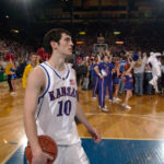This file photo shows a handful of KU fans celebrating on the court behind former Jayhawk after KU's thrilling victory over No. 3 Texas in January 2003.