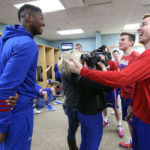 Kansas forward Carlton Bragg Jr. (15) jokes with student manager Chip Kueffer as Kueffer and other student managers are interviewed by media members, Friday, March 18, 2016 at Wells Fargo Arena in Des Moines.