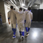 Kansas guard Frank Mason III rests his elbows on the shoulders of teammates Wayne Selden Jr., left, and Devonte' Graham as the starting five make their way toward interviews with media members on Friday, March 25, 2016 at KFC Yum! Center in Louisville, Kentucky.