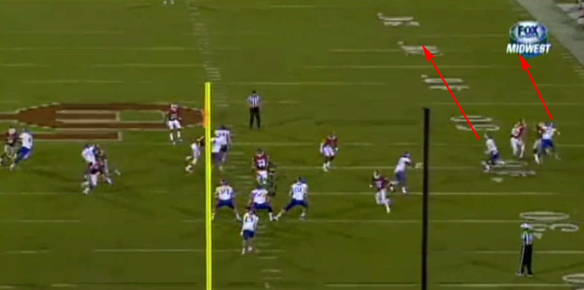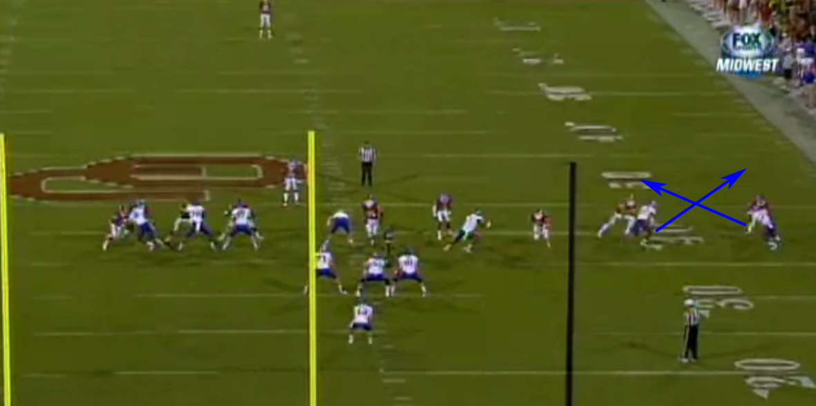 OU’s two players aren’t expecting this, and they nearly collide for a second, which allows both Shepherd and Simmons to get a fairly clean run down the field.