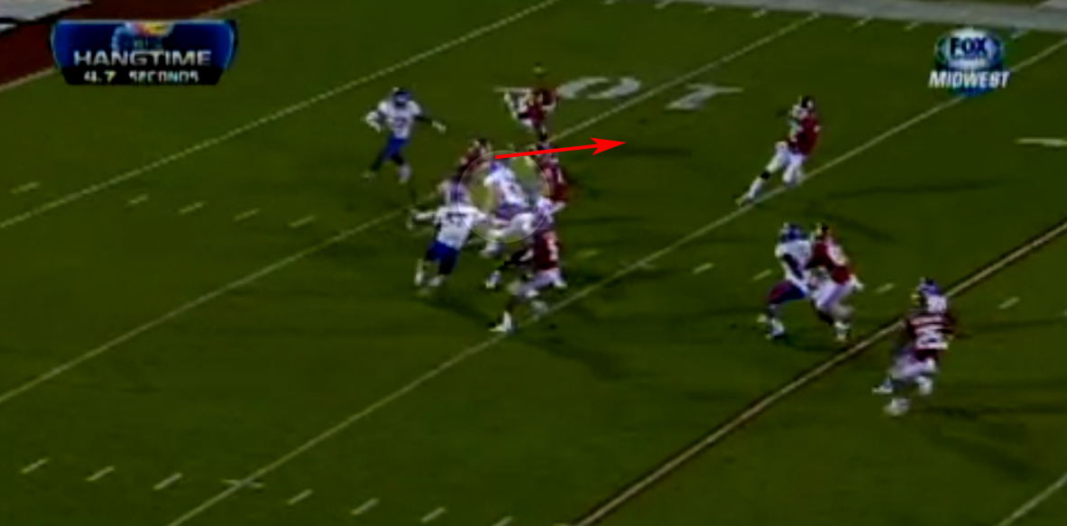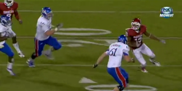 Notice that with their “shield” alignment for the punt, the Jayhawks have all their players lined up from the middle of the field over to the right side of the field.