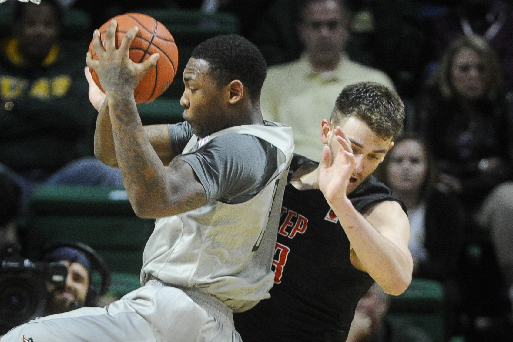 UAB forward Chris Cokley, left, comes up with a rebound in front of UTEP center Hooper Vint during an NCAA college basketball game, Saturday, Jan. 9, 2016, in Birmingham, Ala. UAB won 87-80.
