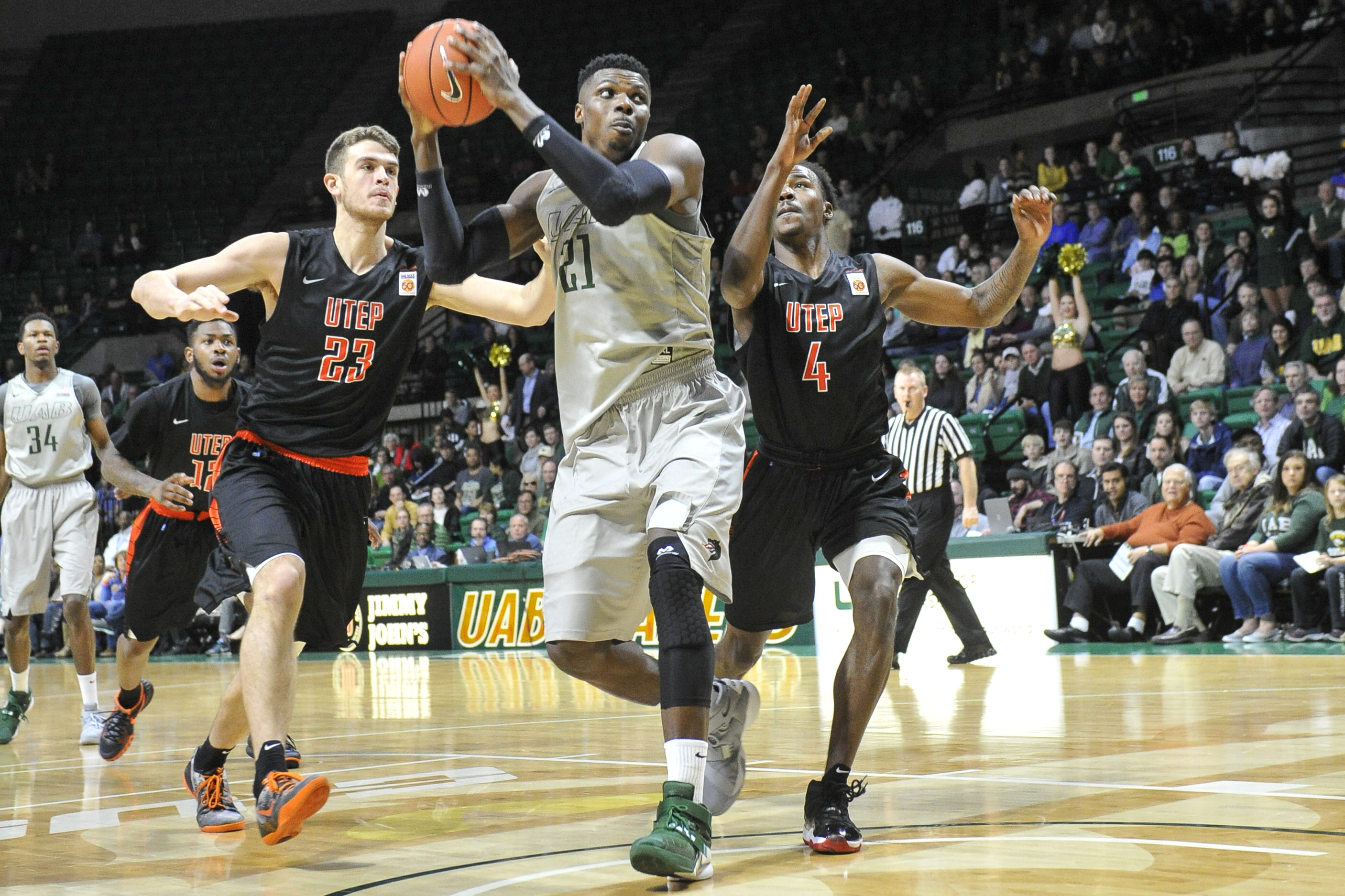 UAB forward Tosin Mehinti (21) is defended by UTEP center Hooper Vint (23), and guard Lee Moore (4) during an NCAA college basketball game, Saturday, Jan. 9, 2016, in Birmingham, Ala. UAB won 87-80.