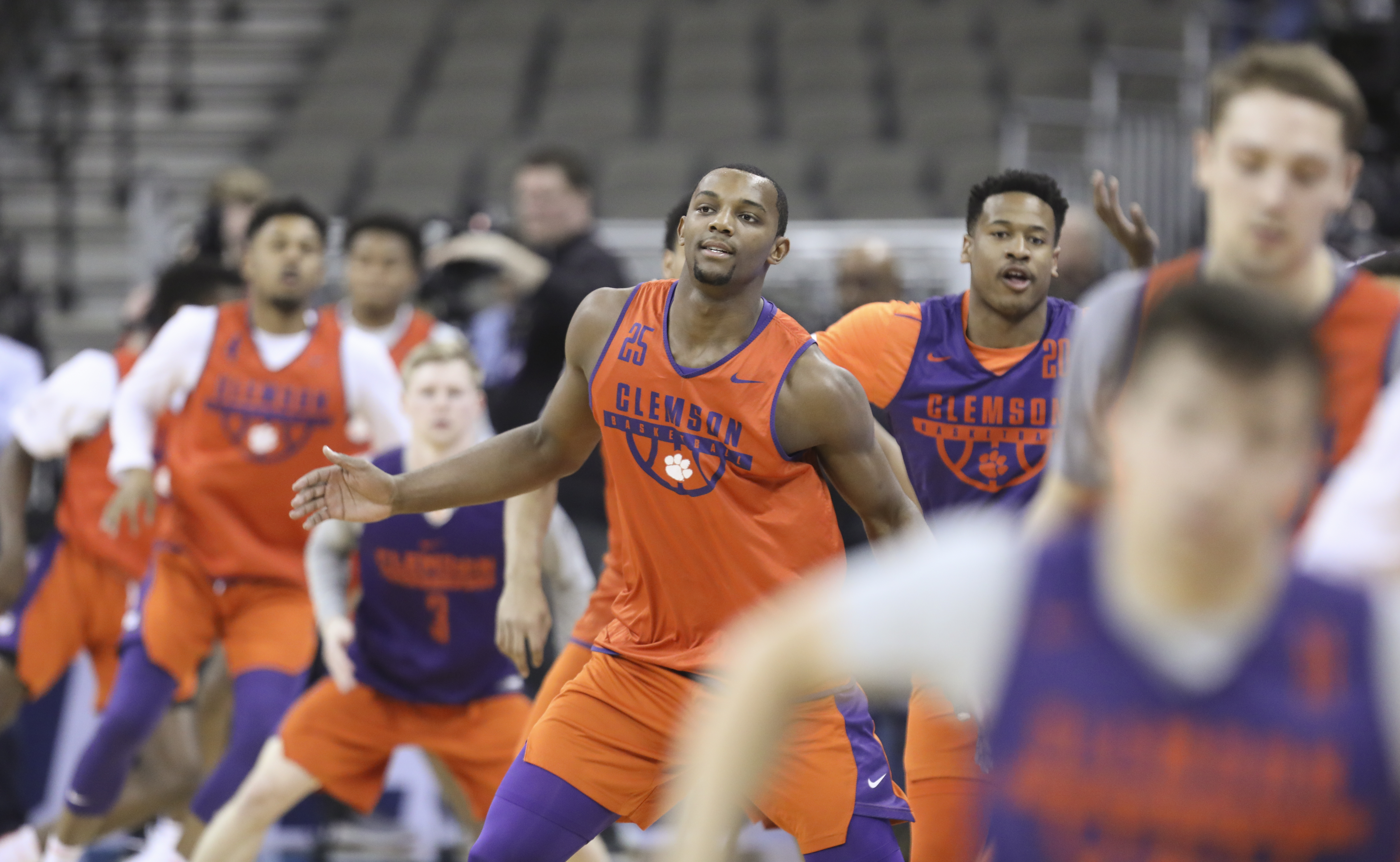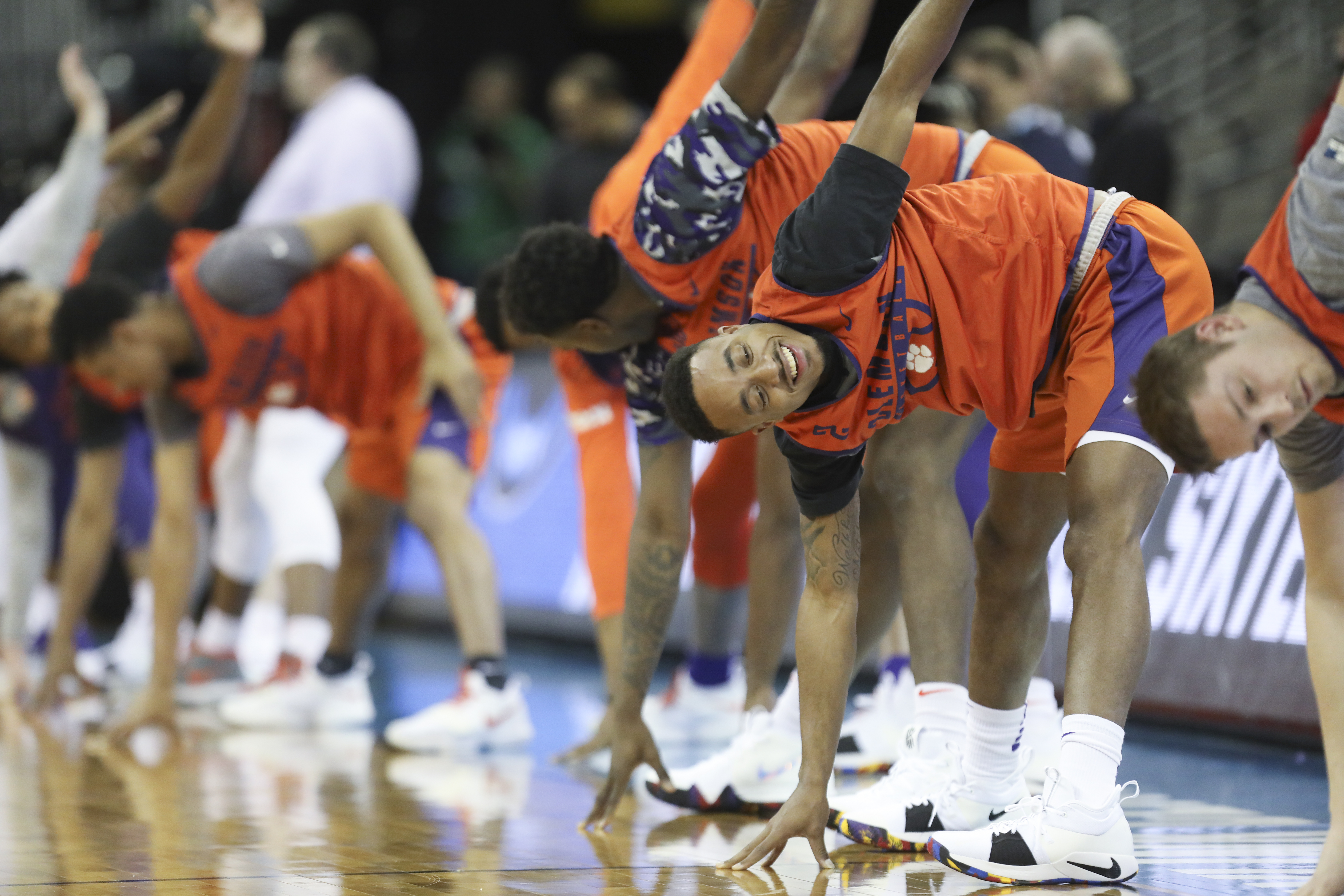 Clemson forward Aamir Simms (25) and the Tigers get warmed up at the start of practice on Thursday, March 22, 2018 at CenturyLink Center in Omaha, Neb.