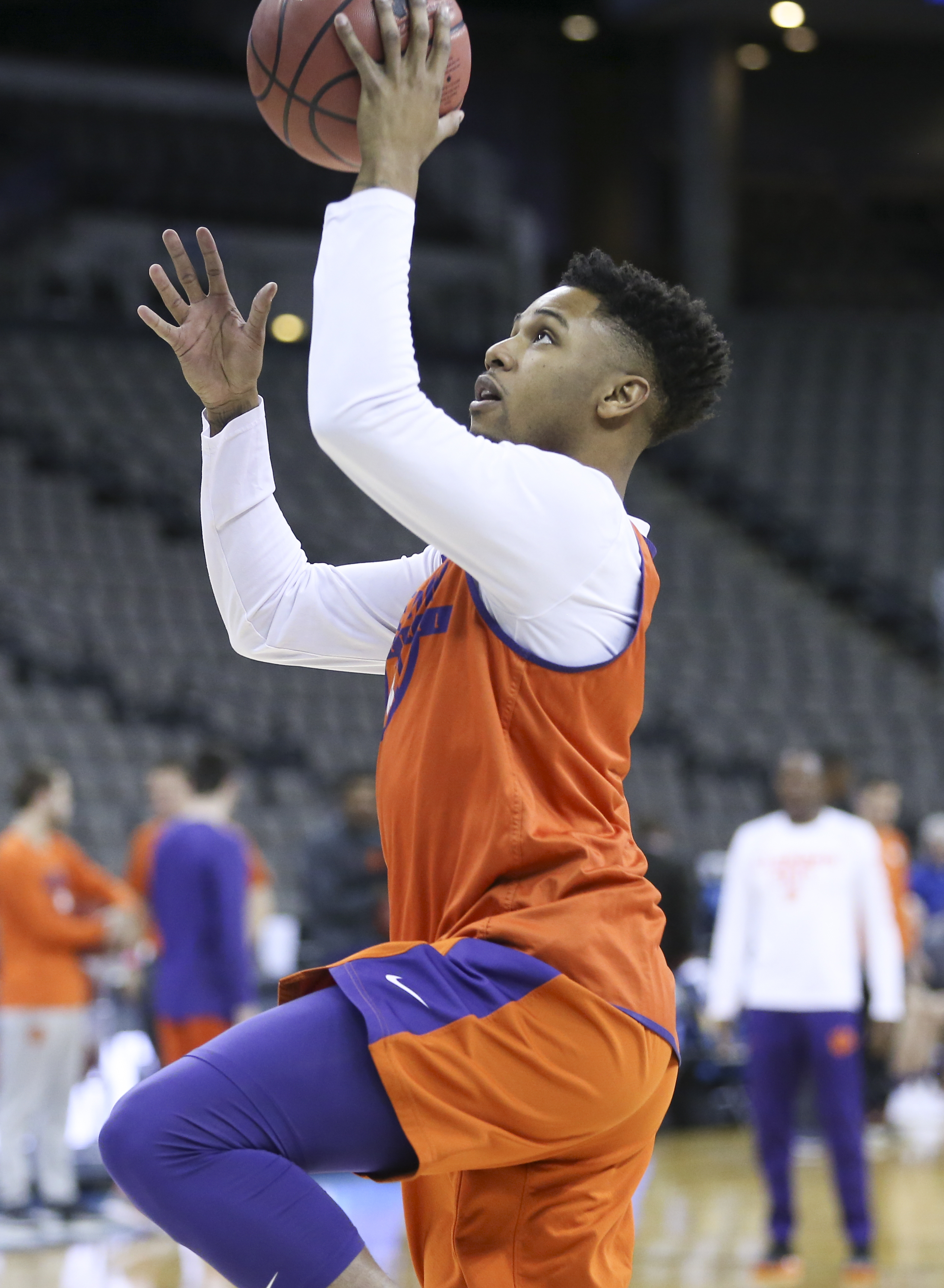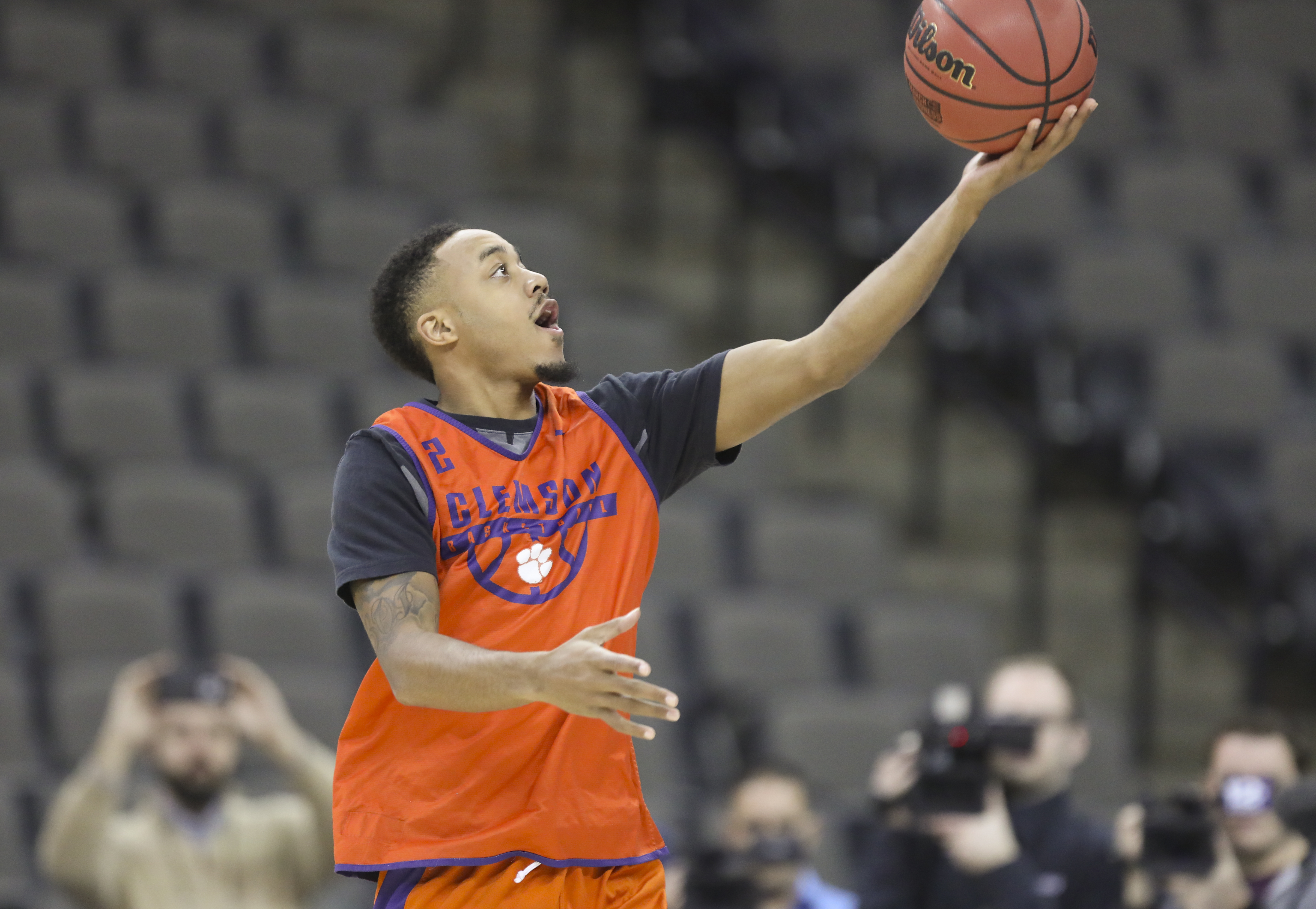 Clemson guard Shelton Mitchell (4) goes up to the bucket during practice on Thursday, March 22, 2018 at CenturyLink Center in Omaha, Neb.