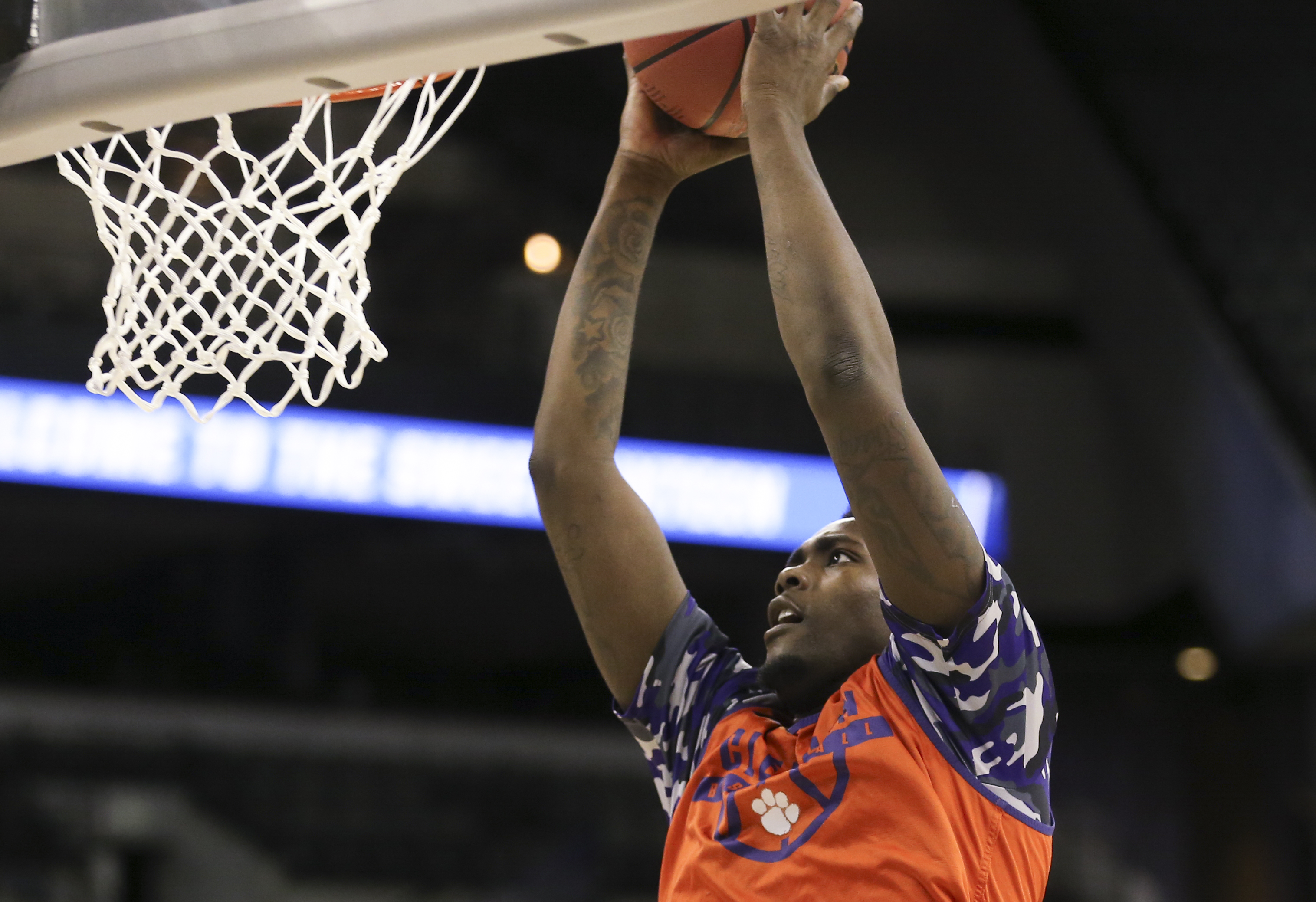 Clemson forward Elijah Thomas comes in for a dunk during practice on Thursday, March 22, 2018 at CenturyLink Center in Omaha, Neb.