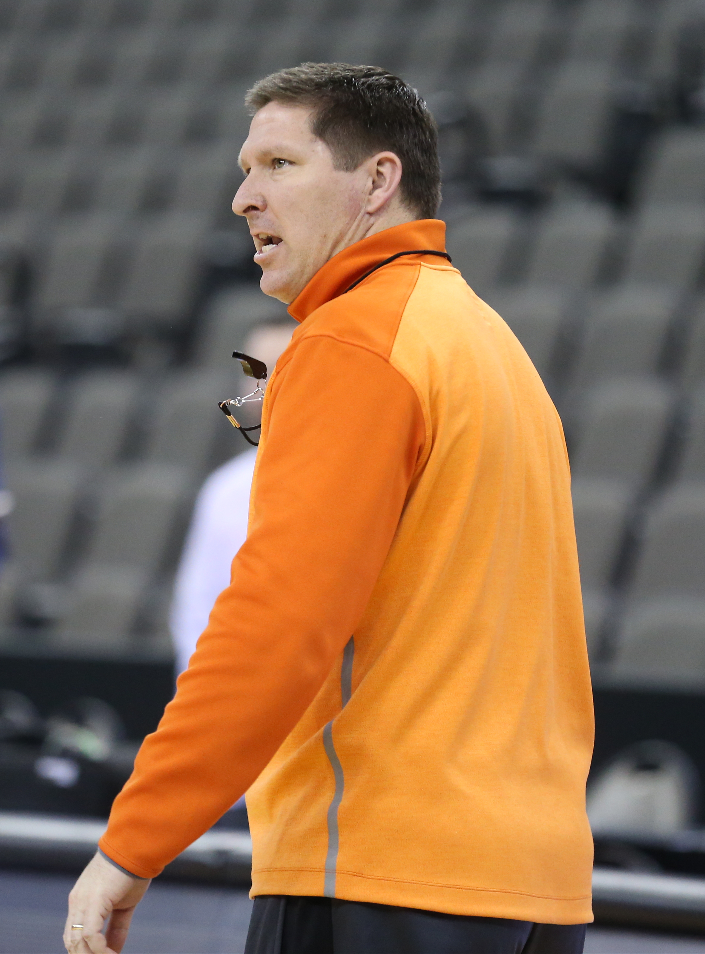 Clemson head coach Brad Brownell conducts the Tigers practice on Thursday, March 22, 2018 at CenturyLink Center in Omaha, Neb.