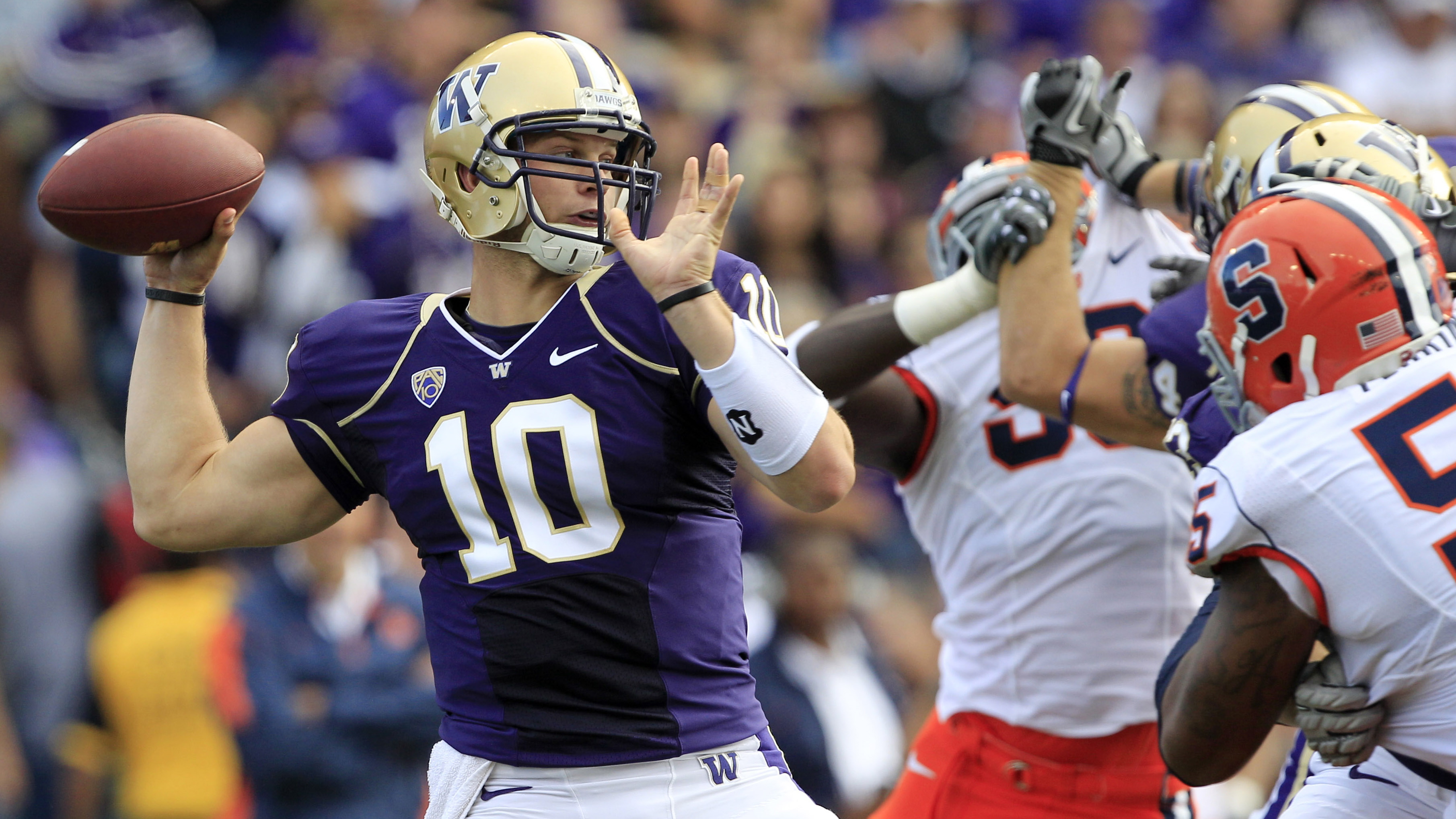 Washington quarterback Jake Locker (10) throws against Syracuse in the second quarter of an NCAA college football game on Saturday, Sept. 11, 2010, in Seattle. (AP Photo/Elaine Thompson)