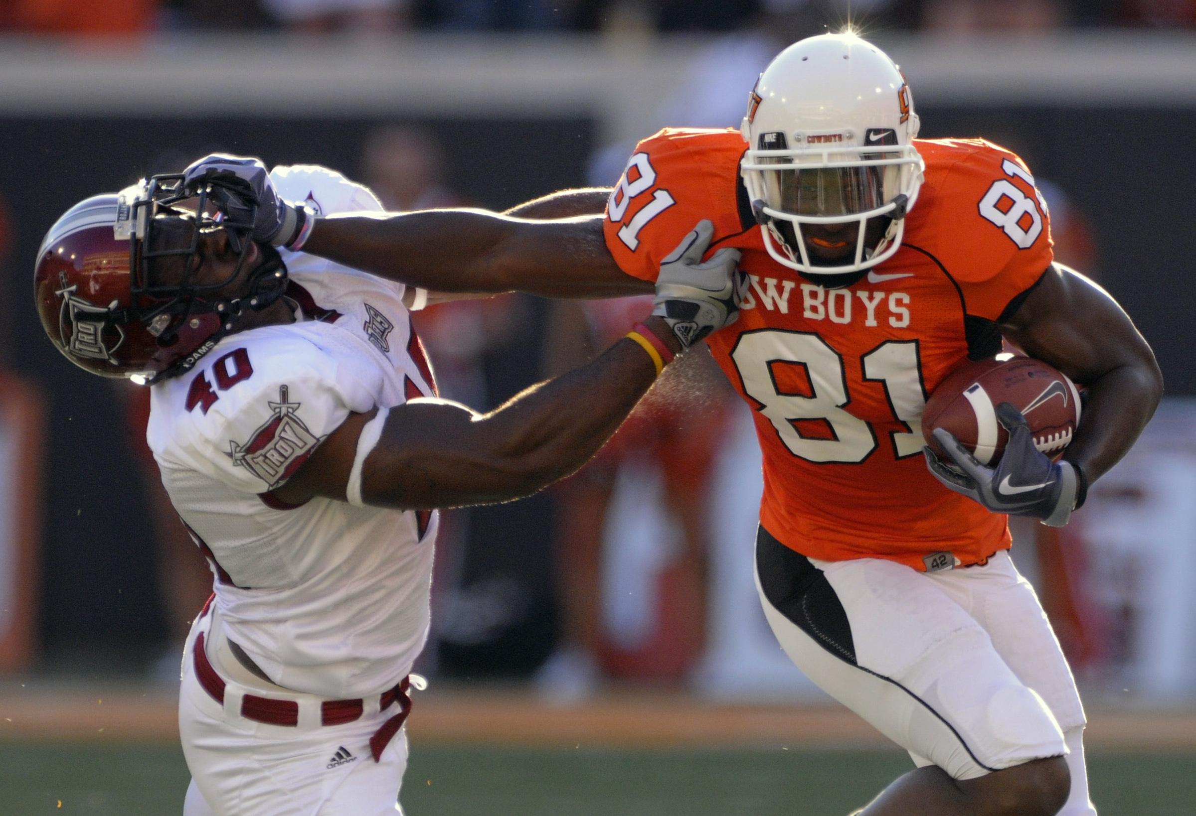 Oklahoma State wide receiver Justin Blackmon, right, fends off Troy linebacker Donnell Golden, left, during the first half of an NCAA college football game in Stillwater, Okla. Saturday, Sept. 11, 2010. (AP Photo/Brody Schmidt)