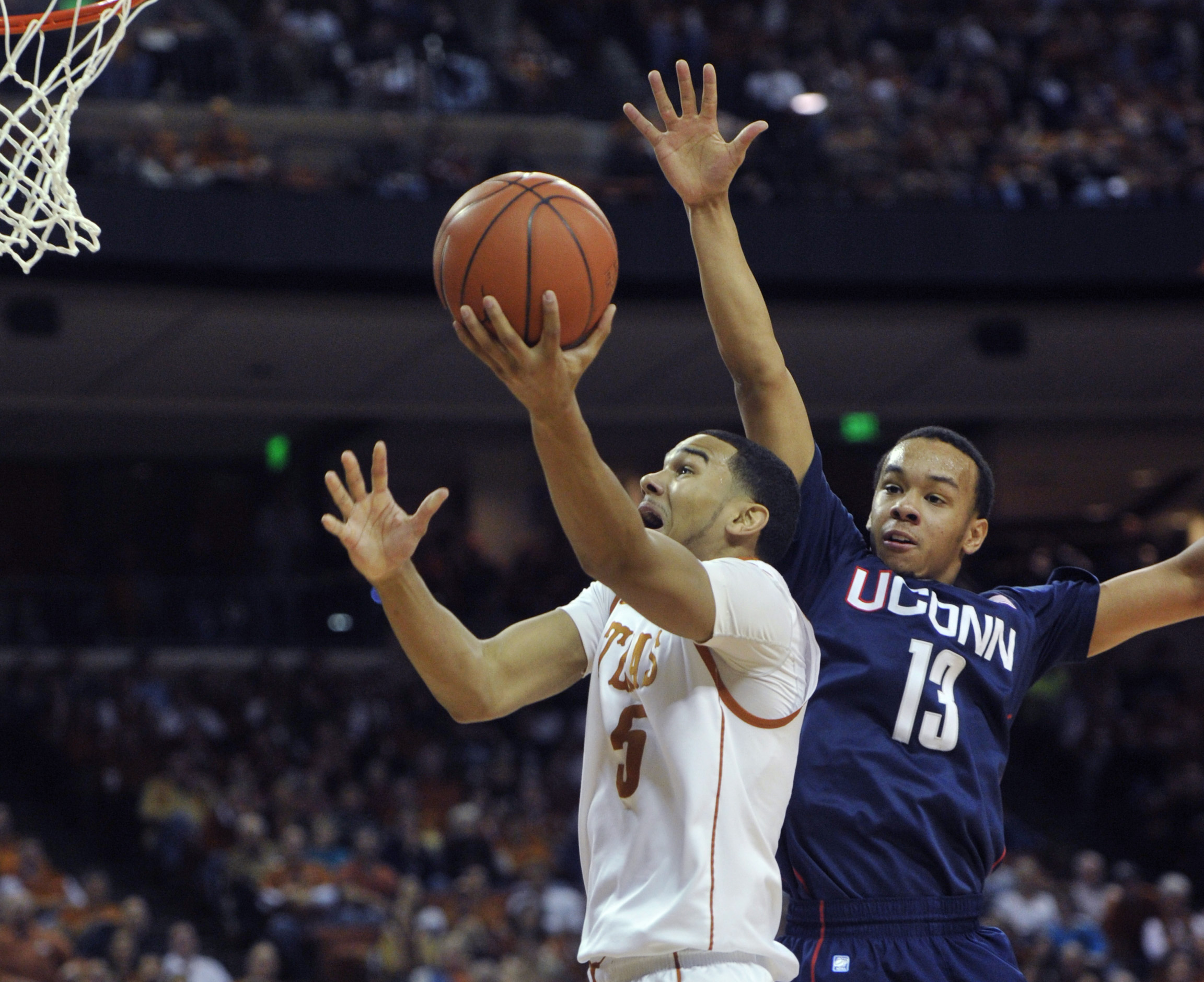Texas guard Cory Joseph (5) lays the ball up against Connecticut guard Shabazz Napier (13) during the first half in an NCAA college basketball game Saturday, Jan. 8, 2011, in Austin, Texas. (AP Photo/Michael Thomas)