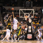 Nick Krug/Journal-World Photo Baylor guard LaceDarius Dunn puts up a jumper over Kansas forward Markieff Morris during the second half Thursday, March 12, 2009 at the Ford Center in Oklahoma City.