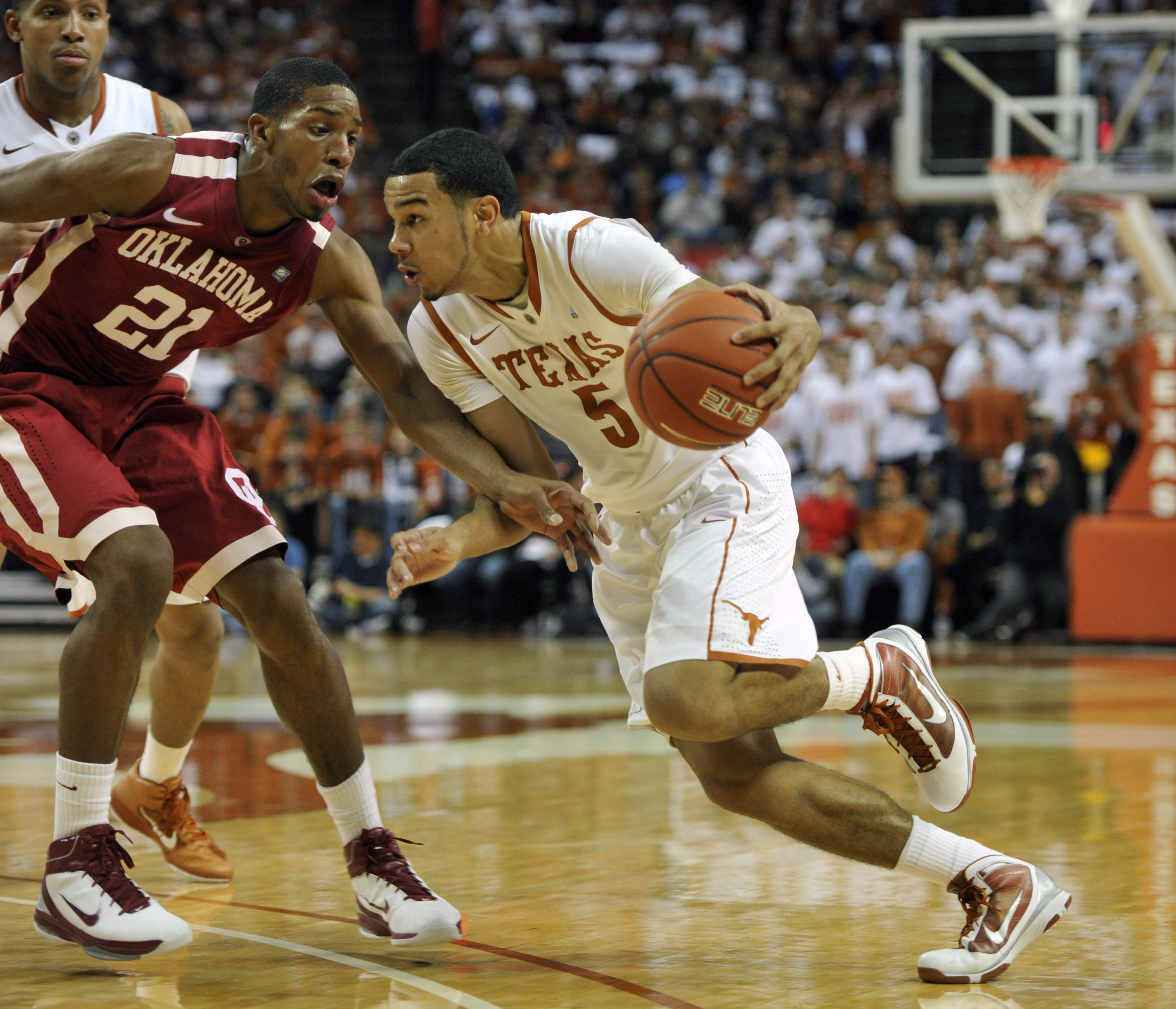 Texas guard Cory Joseph (5) drives around Oklahoma guard Cameron Clark (21) during the first half in an NCAA college basketball game Saturday, Jan. 15, 2011, in Austin, Texas. (AP Photo/Michael Thomas)