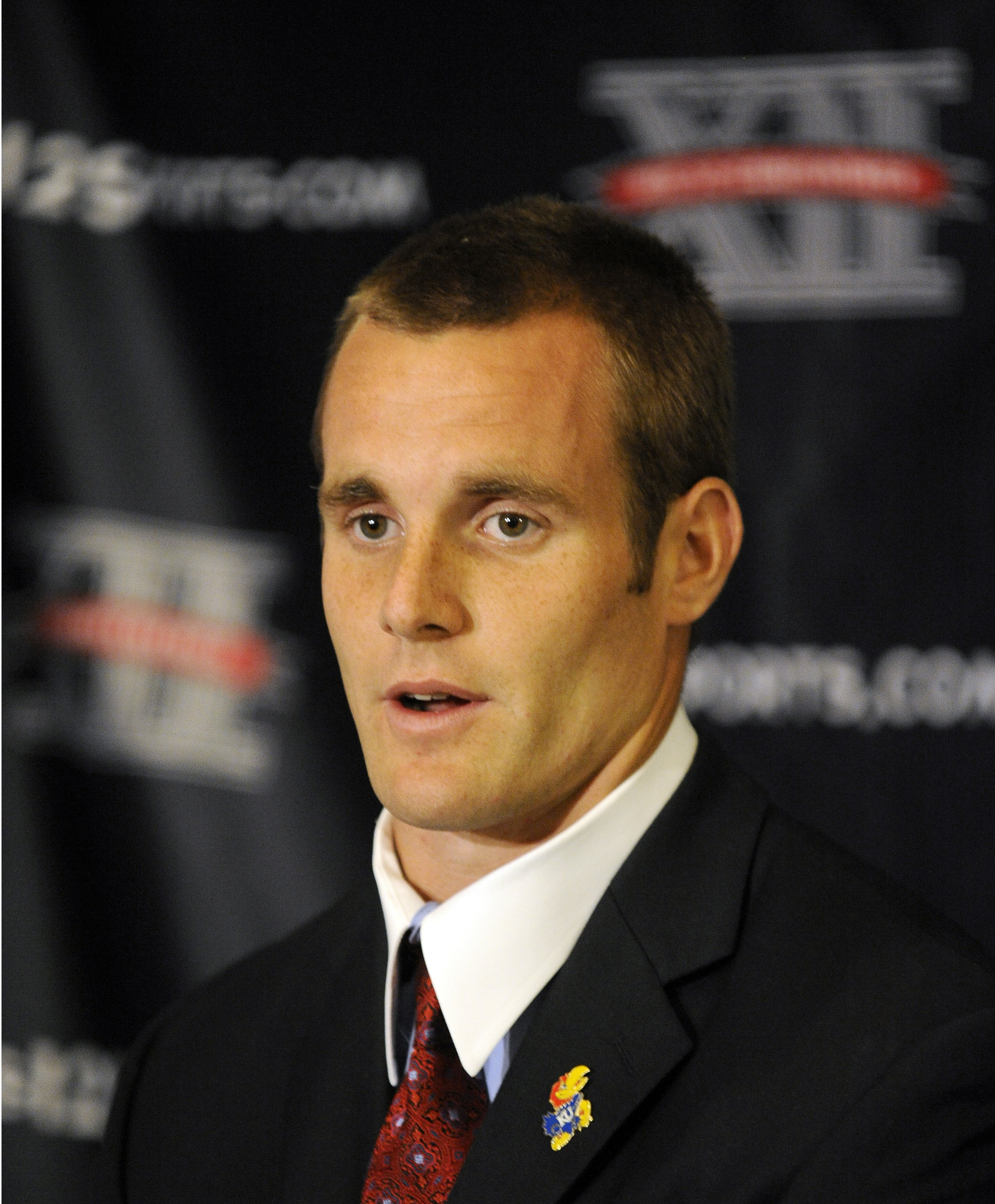 Kansas quarterback Dayne Crist speaks during the Big 12 college football media days on Tuesday, July 24, 2012, in Dallas.