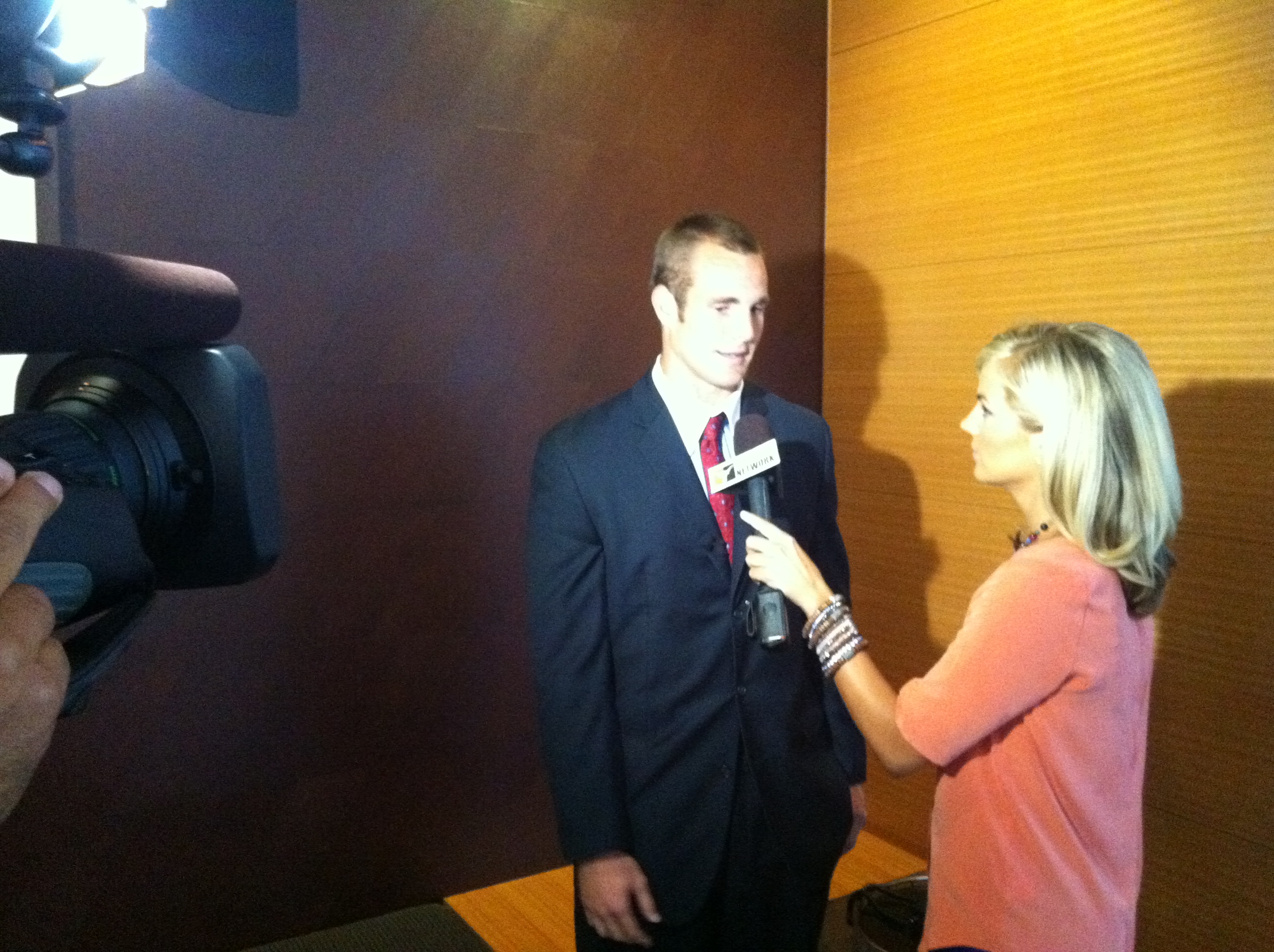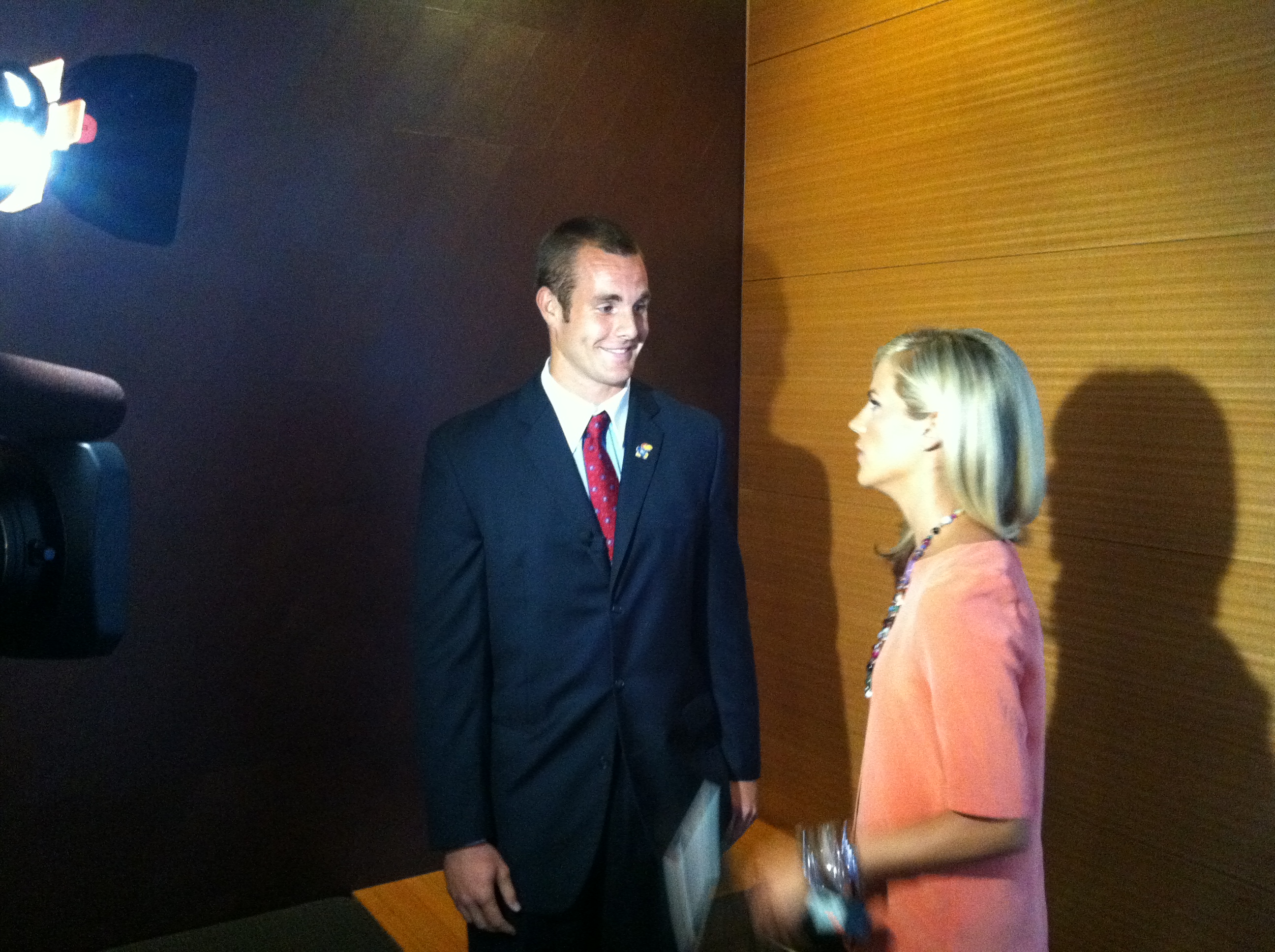 Kansas quarterback Dayne Crist talks with ESPN's Samantha Steele before an interview on Tuesday at Big 12 media days in Dallas.