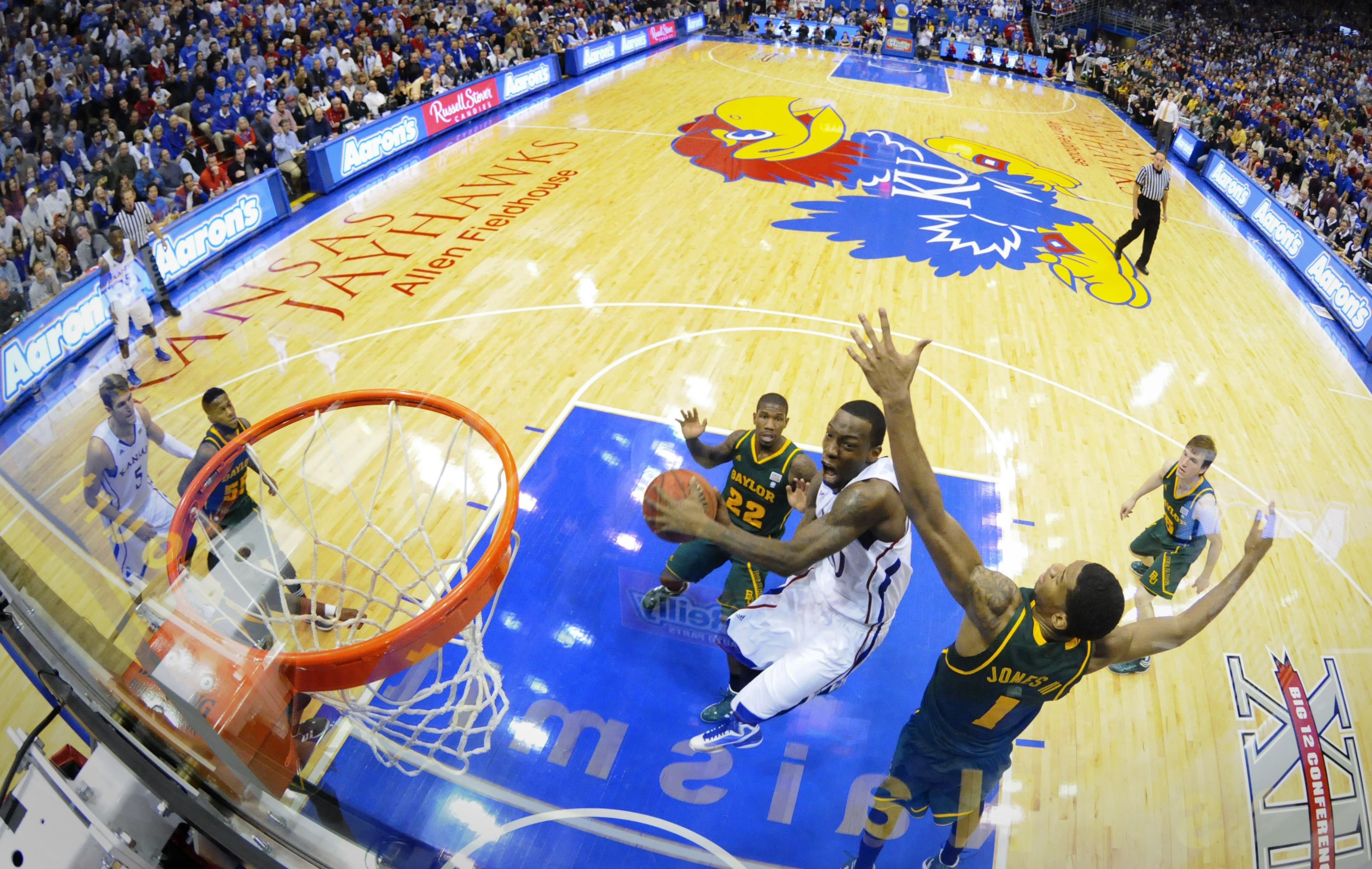 Kansas guard Tyshawn Taylor dips under Baylor forward Perry Jones for a bucket during the second half on Monday, Jan. 16, 2012 at Allen Fieldhouse.