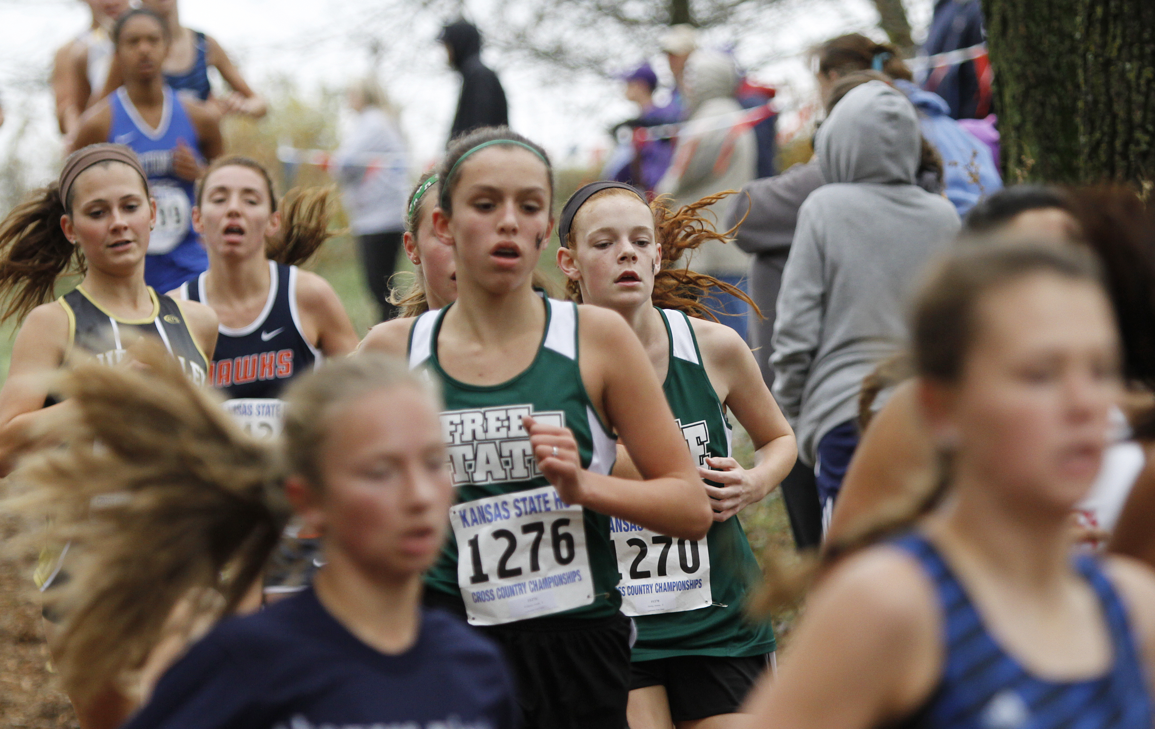 Lawrence Free State runners Sarah Walpole, center left, and Emma Hertig, right, run in the middle of a pack during the Kansas 6A girls state cross country race Saturday, Oct. 31, 2015 at Rim Rock Farm.