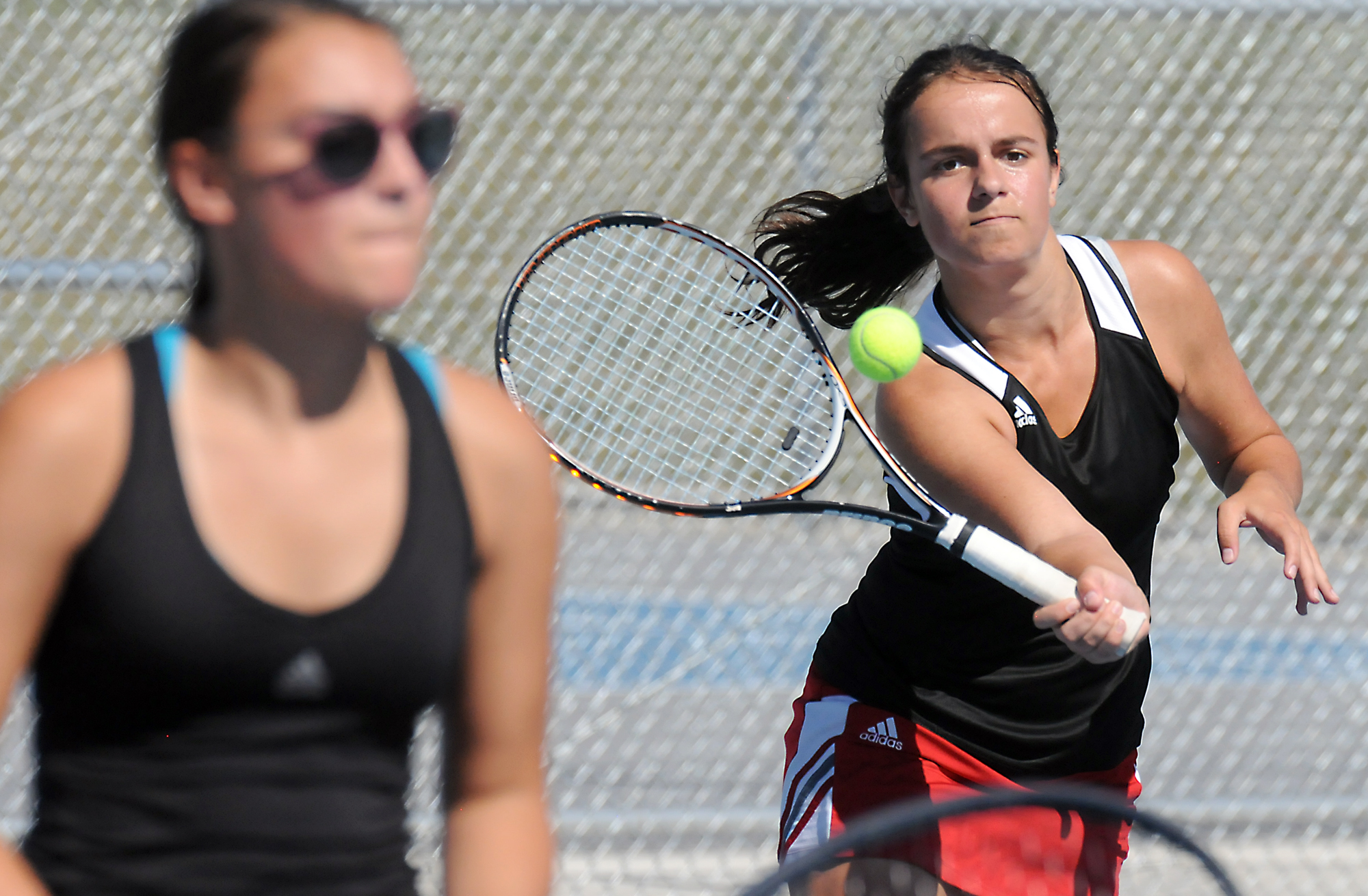 Natalie Cote advances to the ball during doubles Regional tennis action Saturday in Gardner.