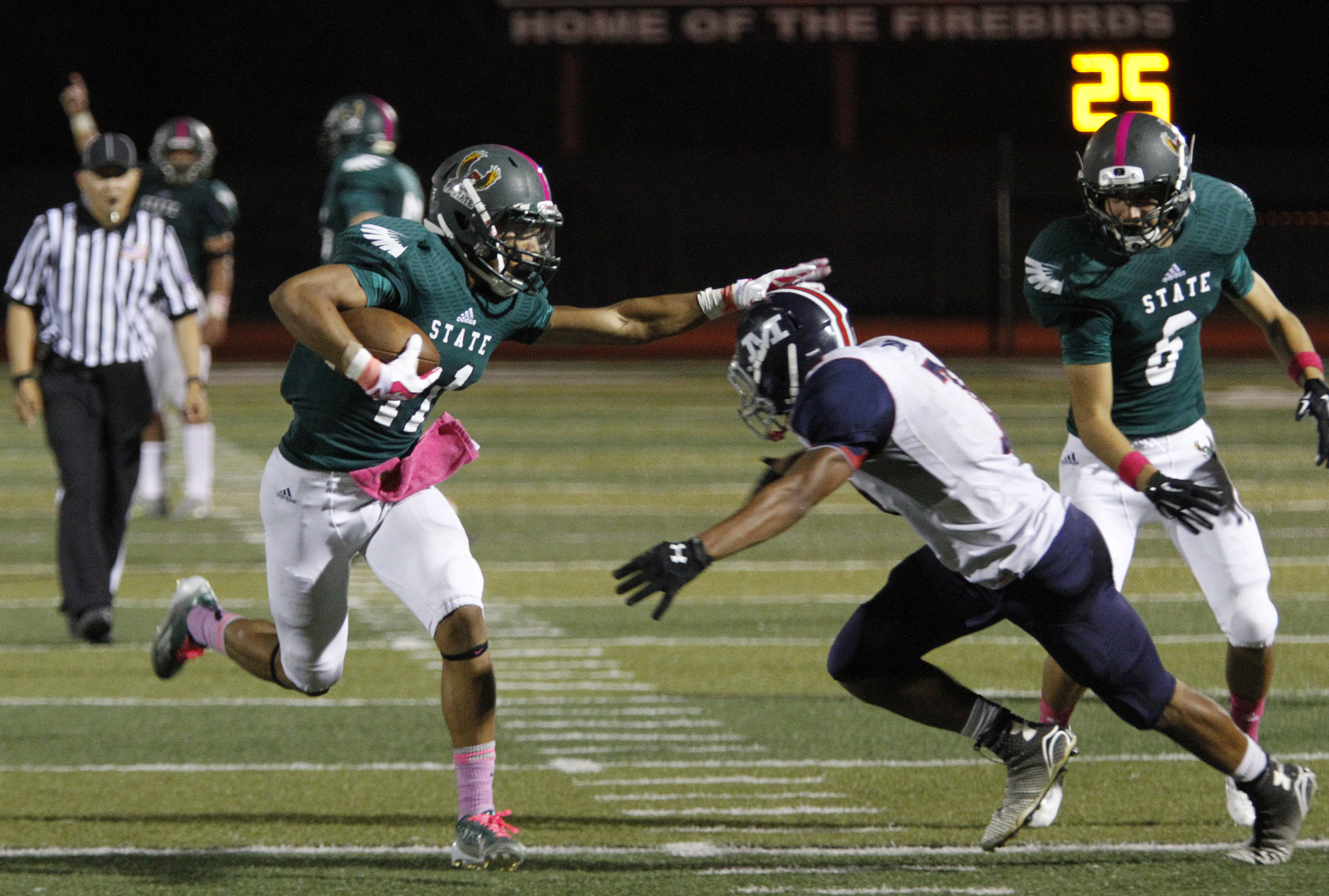 6. Zion Bowlin, RB — Free State’s coaches provided a new way to get the junior running back involved on offense, with a new passing play. Bowlin, who had been protecting on most of the Firebirds’ throwing downs, slipped out and came up with an amazing catch for a six-yard TD in the fourth quarter. Bowlin caught three passes for 55 yards.