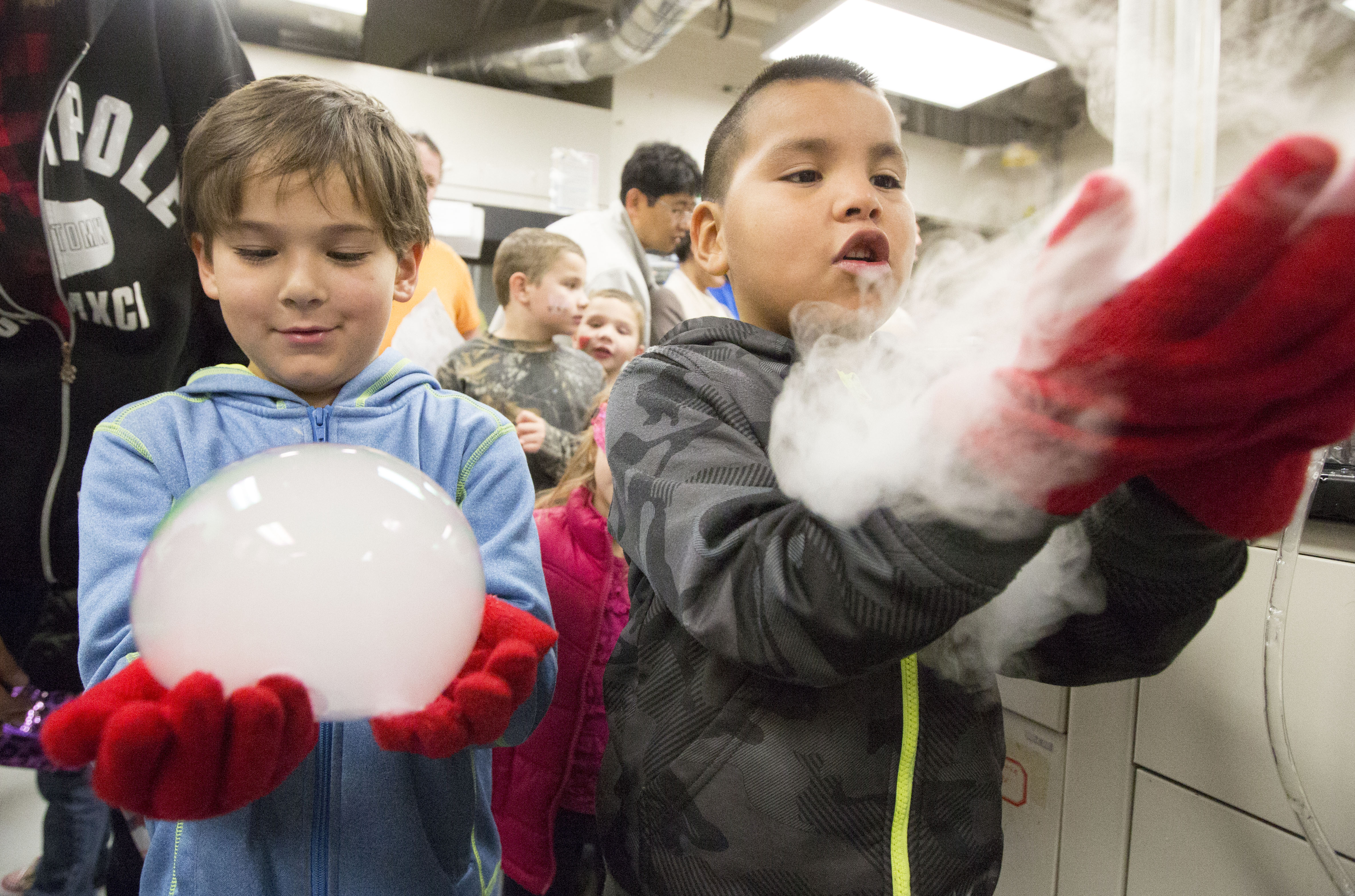Five-year-old Jaidon Cochran, left, uses gloves to hold a soapy bubble as six-year-old Isaiah Garcia, both of Lawrence, watches his bubble burst during the 19th annual Carnival of Chemistry held in Malott Hall, 1251 Wescoe Hall Drive, Sunday afternoon. The bubbles were made by mixing dry ice and hot water, causing it to sublimate, or change from a solid to a gas without melting. The gas was then used to fill a mixture of soapy water and glycerine to form the bubbles.