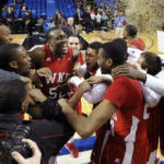 Western Kentucky's T.J. Price (52) celebrates with teammates after the Sun Belt Conference championship game against Florida International on Monday, March 11, 2013, in Hot Springs, Ark., Monday, March 11, 2013. Western Kentucky won 65-63. Price was named the tournament's most valuable player. WKU will face Kansas University in the first round of the NCAA Tournament on Friday, March 22, 2013, in Kansas City, Mo.
