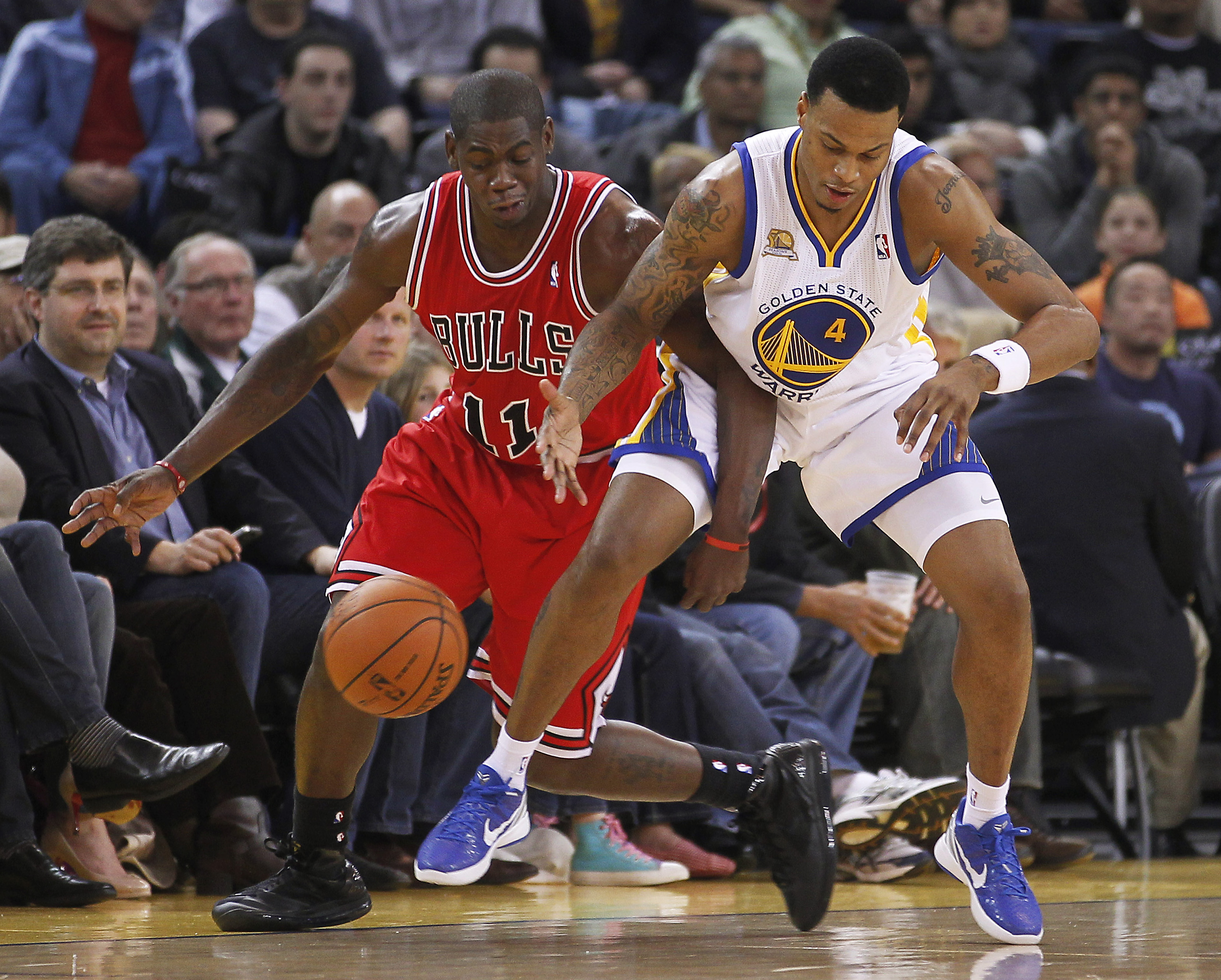Chicago Bulls' Ronnie Brewer (11) vies for a loose ball with Golden State Warriors' Brandon Rush (4) during the first half of an NBA basketball game Monday, Dec. 26, 2011, in Oakland, Calif.