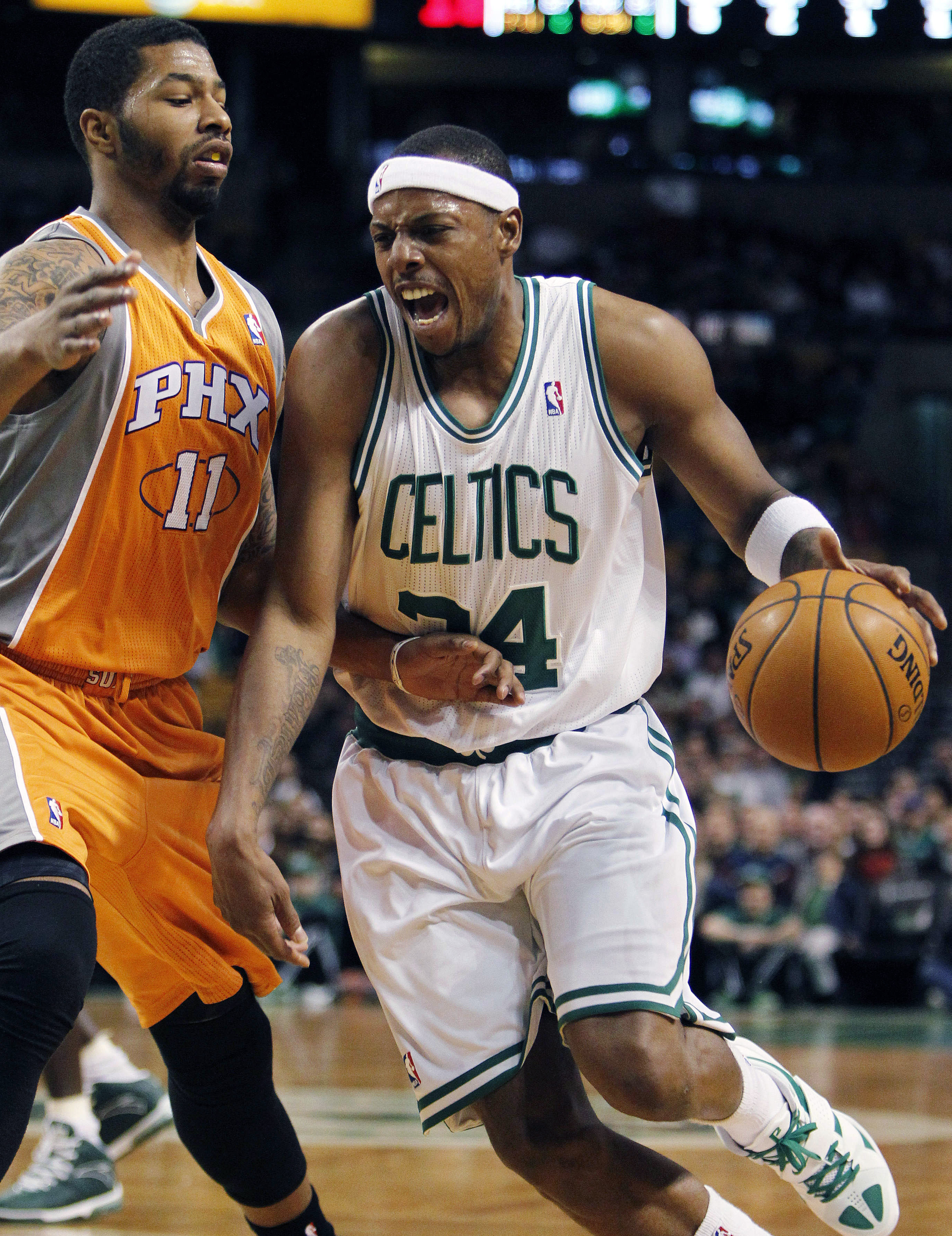 Boston Celtics' Paul Pierce (34) drives past Phoenix Suns' Markieff Morris (11) in the first quarter of an NBA basketball game in Boston on Friday, Jan. 20, 2012.