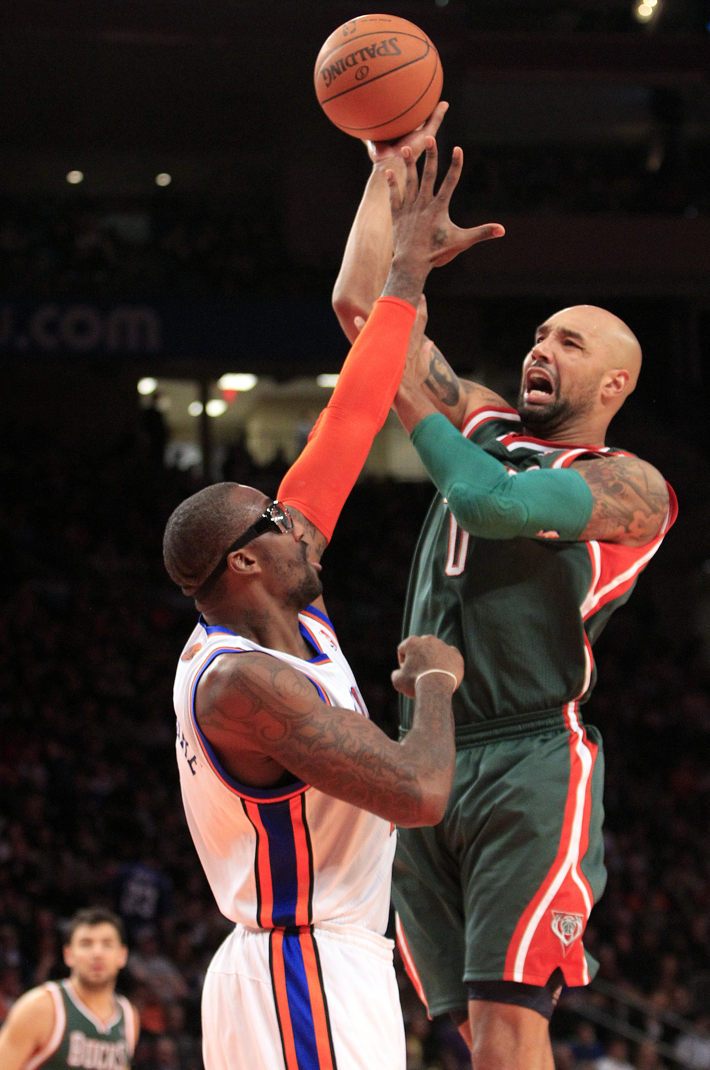 Drew Gooden (0) shoots over New York Knicks' Amare Stoudemire during the second half of an NBA basketball game on Friday, Jan. 20, 2012, in New York. The Bucks won the game 100-86.