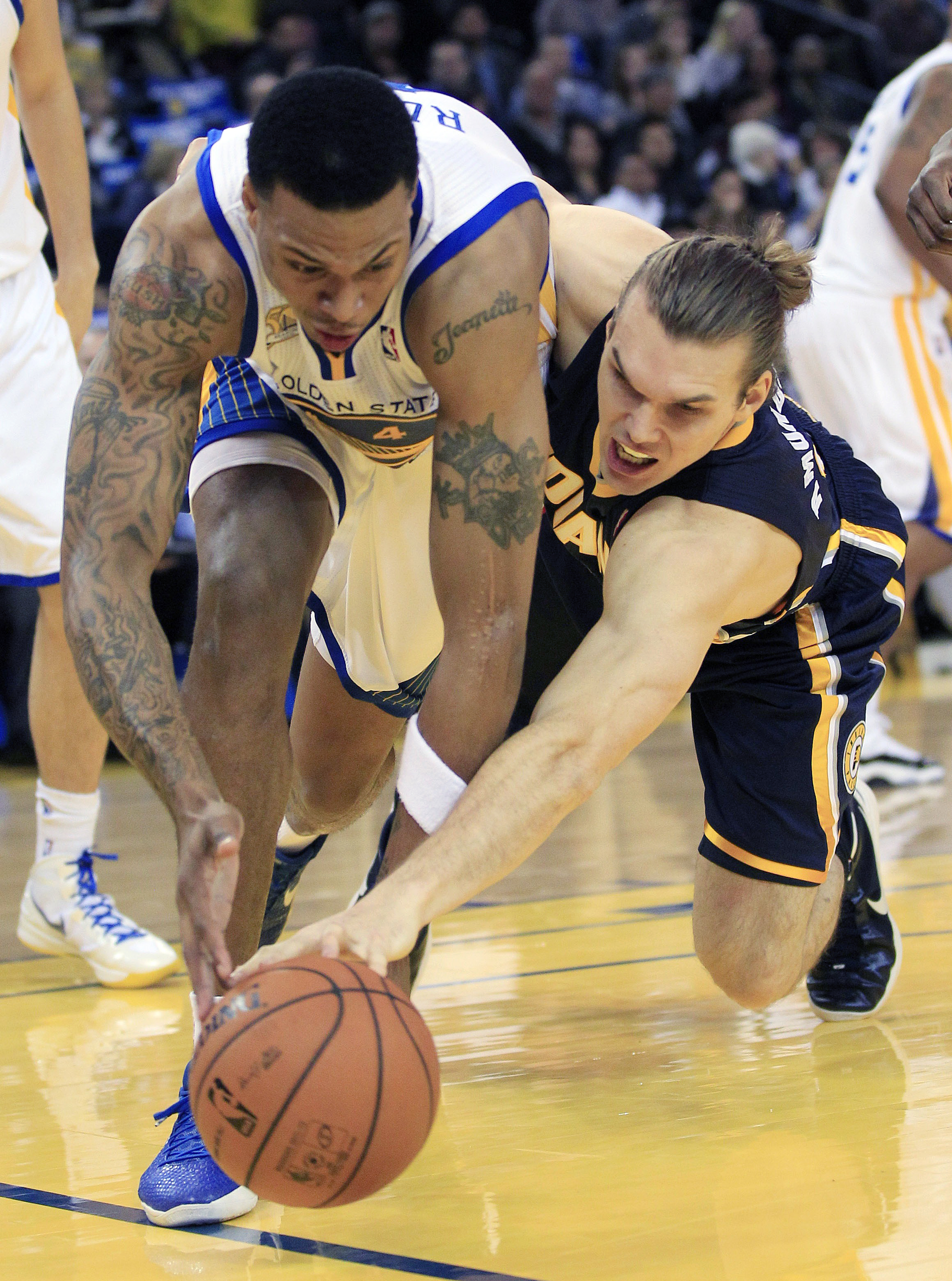 Indiana Pacers' Louis Amundson (17) battles for a loose ball against Golden State Warriors' Brandon Rush (4) during the first half of an NBA basketball game in Oakland, Calif., Friday, Jan. 20, 2012.
