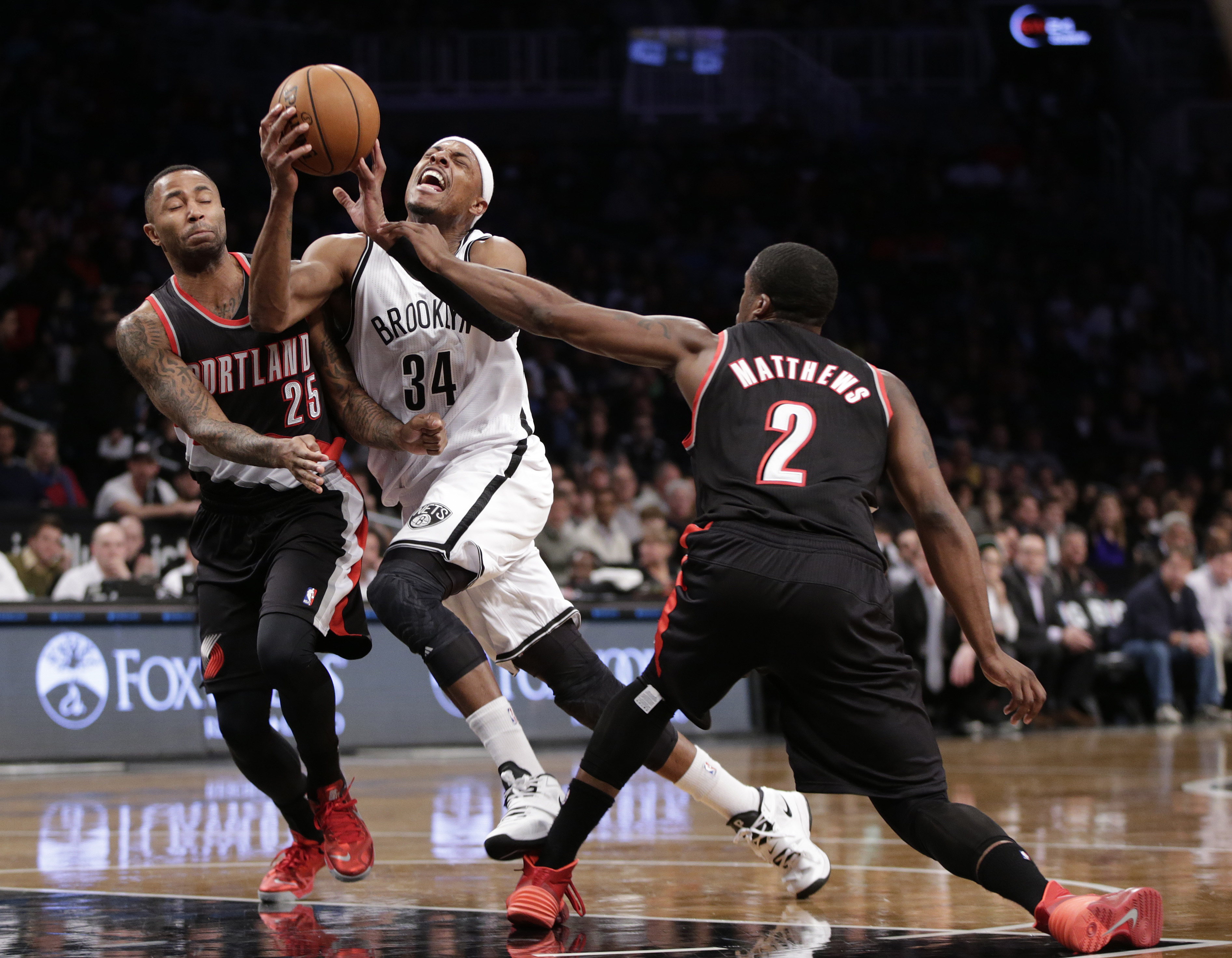 Brooklyn Nets forward Paul Pierce (34) reacts as he is sandwiched between Portland Trail Blazers point guard Mo Williams (25) and Trail Blazers guard Wesley Matthews (2) while driving toward the basket in the first half of their their NBA basketball game at the Barclays Center, Monday, Nov. 18, 2013, in Brooklyn. (AP Photo/Kathy Willens)