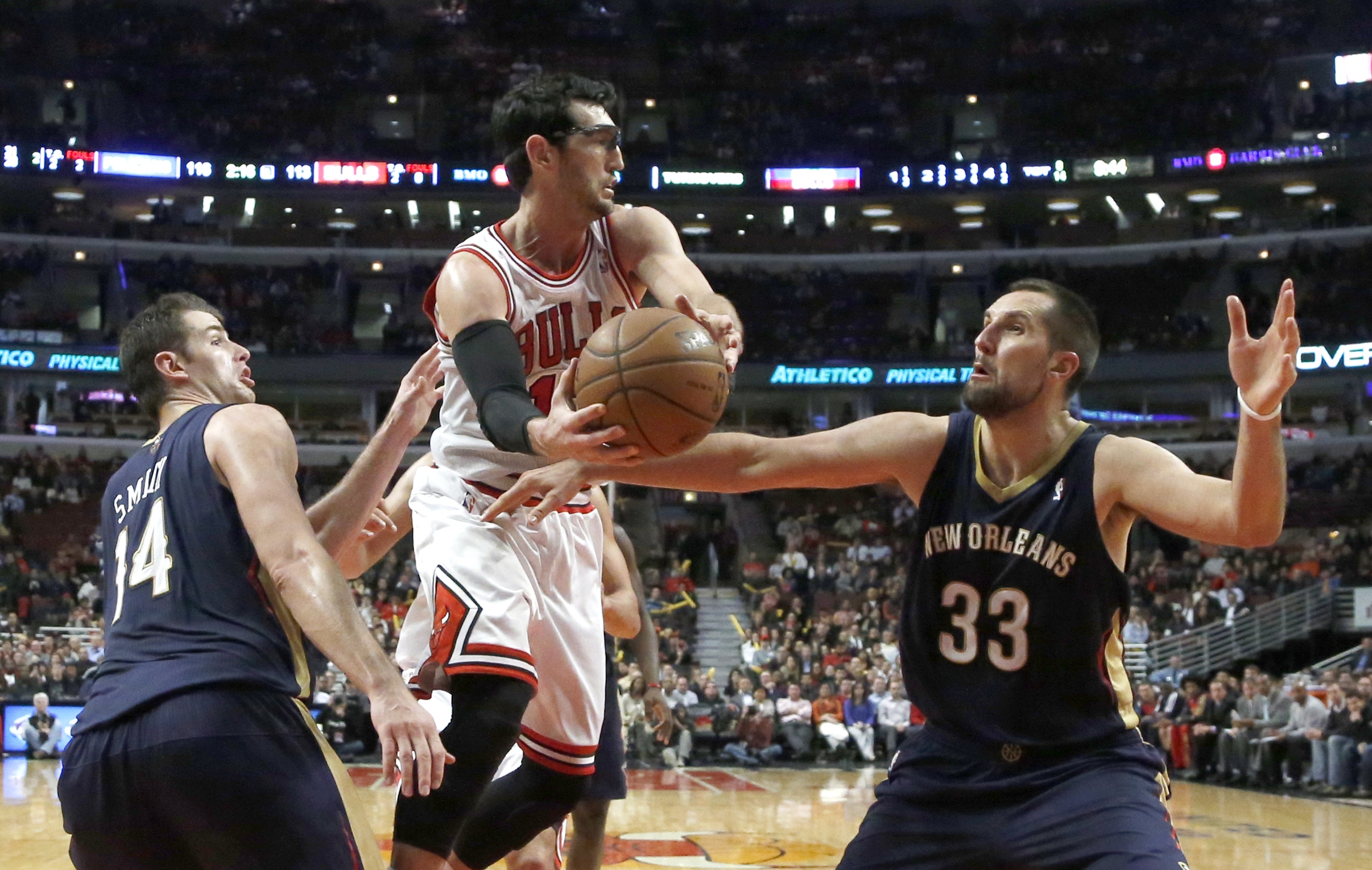 The New Orleans Pelicans's defense of Jason Smith, left, and Ryan Anderson (33) force Chicago Bulls shooting guard Kirk Hinrich (12) to pass the ball under the basket during the second overtime period of an NBA basketball game Monday, Dec. 2, 2013, in Chicago. The Pelicans won 131-128 in triple overtime. (AP Photo/Charles Rex Arbogast)
