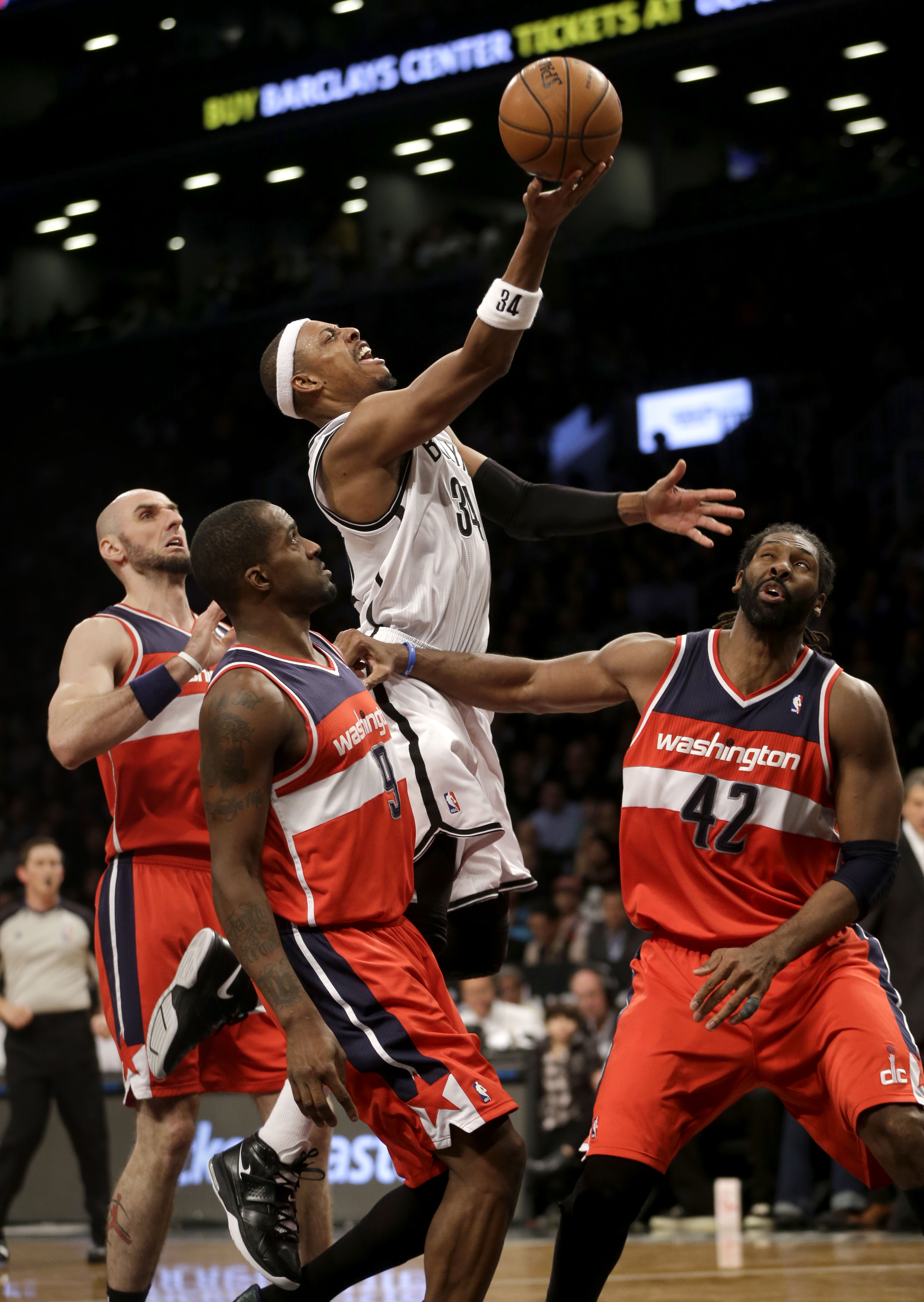 Brooklyn Nets' Paul Pierce, top, scores over Washington Wizards' Marcin Gortat, left, Nene Hilario, right, and Martell Webster during the second half of an NBA basketball game Wednesday, Dec. 18, 2013, in New York. Washington defeated Brooklyn 113-107. (AP Photo/Seth Wenig)