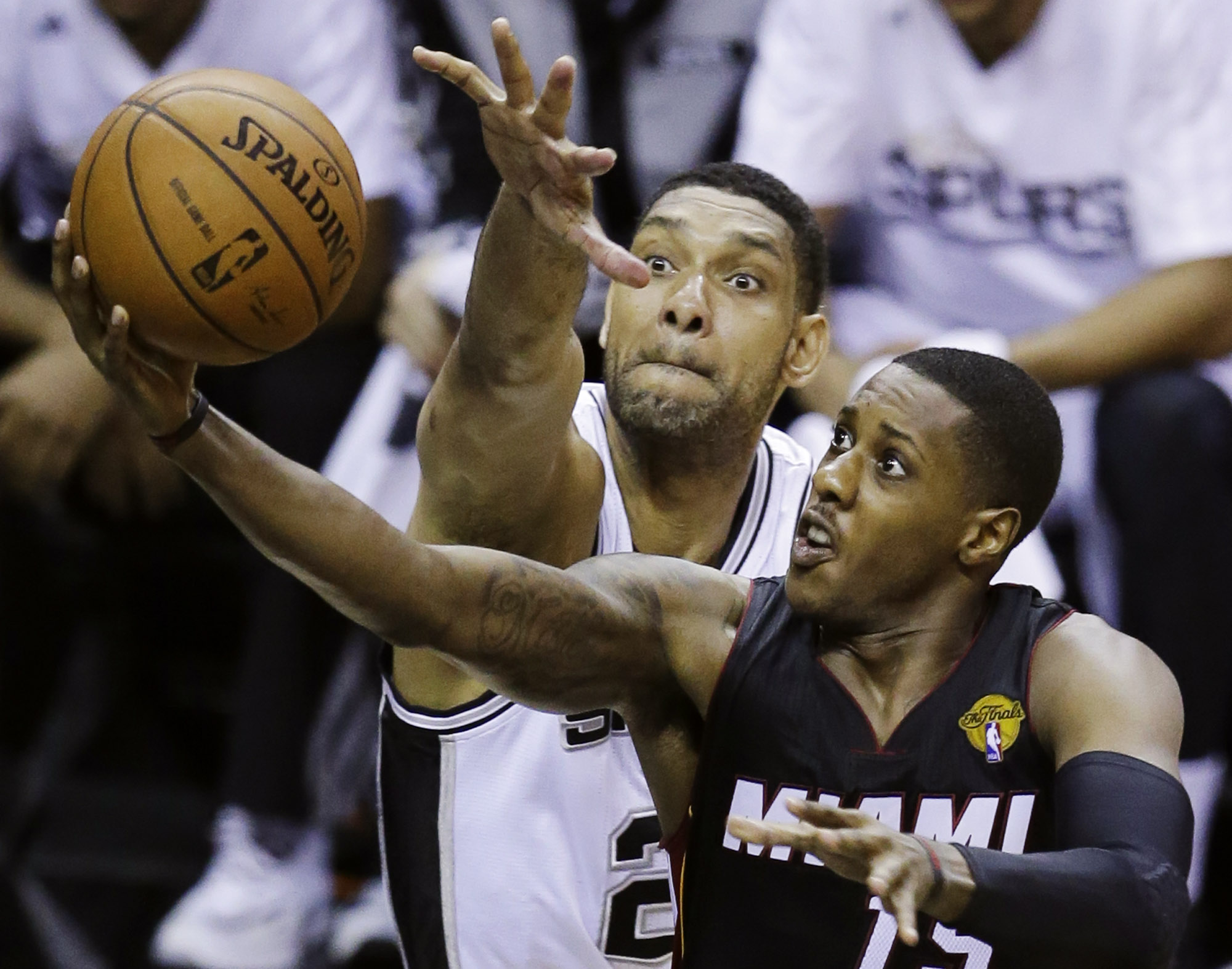Miami Heat guard Mario Chalmers, right, shoots as San Antonio Spurs forward Tim Duncan defends during the second half in Game 2 of the NBA basketball finals on Sunday, June 8, 2014, in San Antonio. (AP Photo/Tony Gutierrez)