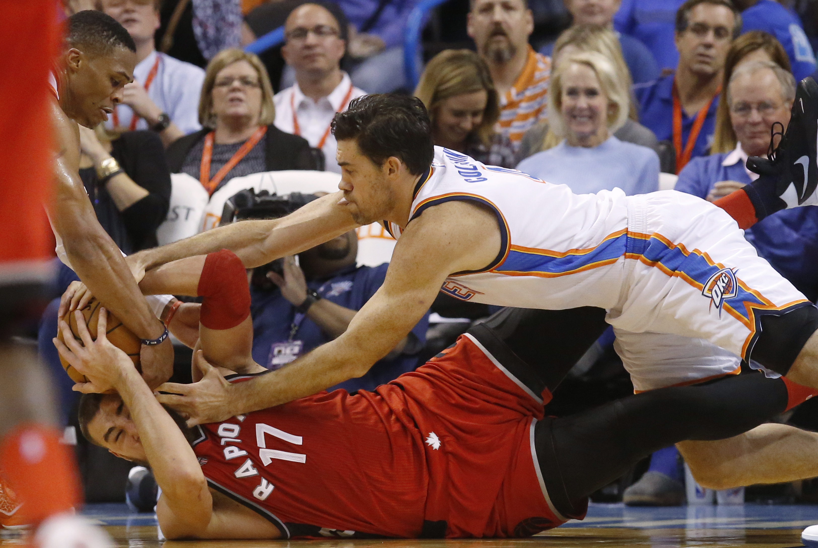 Oklahoma City Thunder guard Russell Westbrook, left, and forward Nick Collison, right, try to take the ball away from Toronto Raptors center Jonas Valanciunas (17) in the third quarter of an NBA basketball game in Oklahoma City, Wednesday, Nov. 4, 2015. Toronto won 103-98. (AP Photo/Sue Ogrocki)