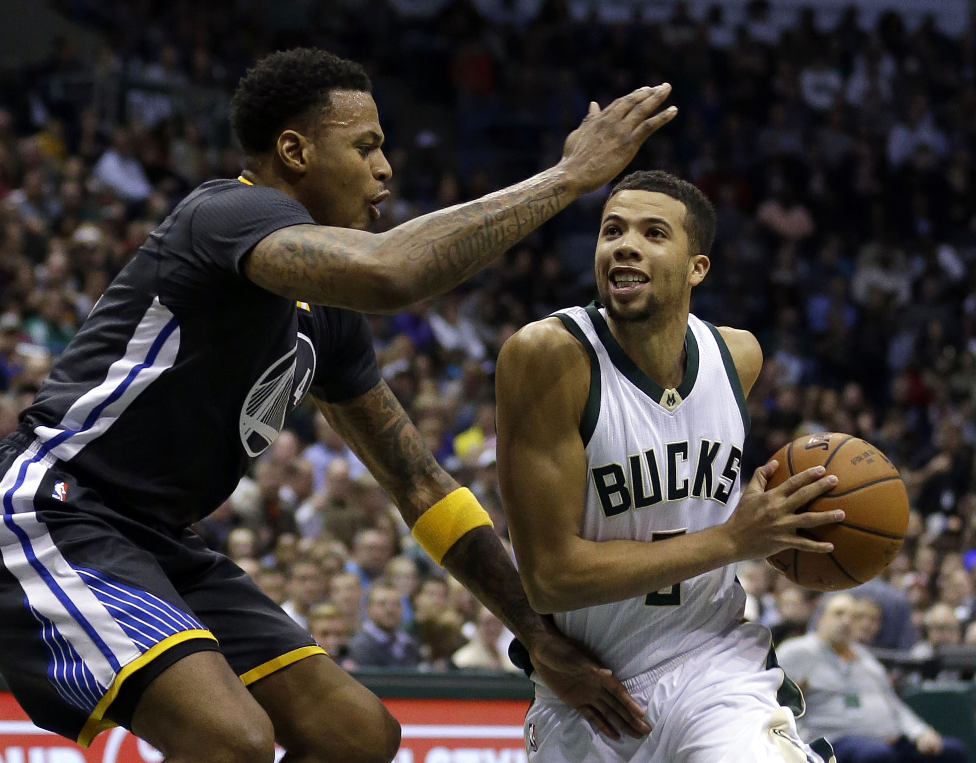 Milwaukee Bucks' Michael Carter-Williams drives against Golden State Warriors' Brandon Rush during the second half of an NBA basketball game Saturday, Dec. 12, 2015, in Milwaukee. The Bucks won 108-95. (AP Photo/Aaron Gash)