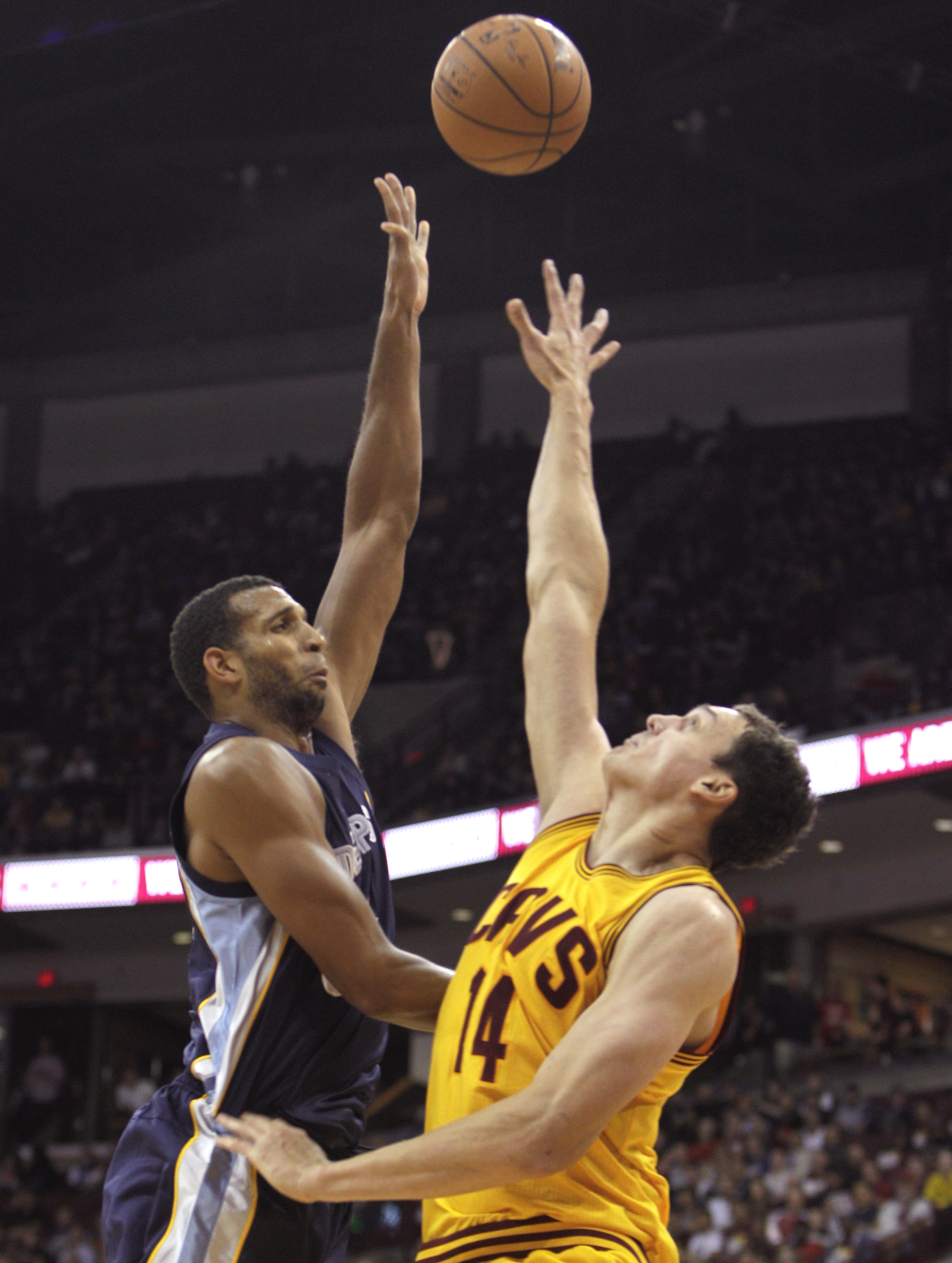 Memphis Grizzlies' Brandan Wright, left, shoots over Cleveland Cavaliers' Sasha Kaun, of Russia, during the third quarter of a preseason NBA basketball game Monday, Oct. 12, 2015, in Columbus, Ohio. The Grizzlies beat the Cavaliers 91-81. (AP Photo/Jay LaPrete)