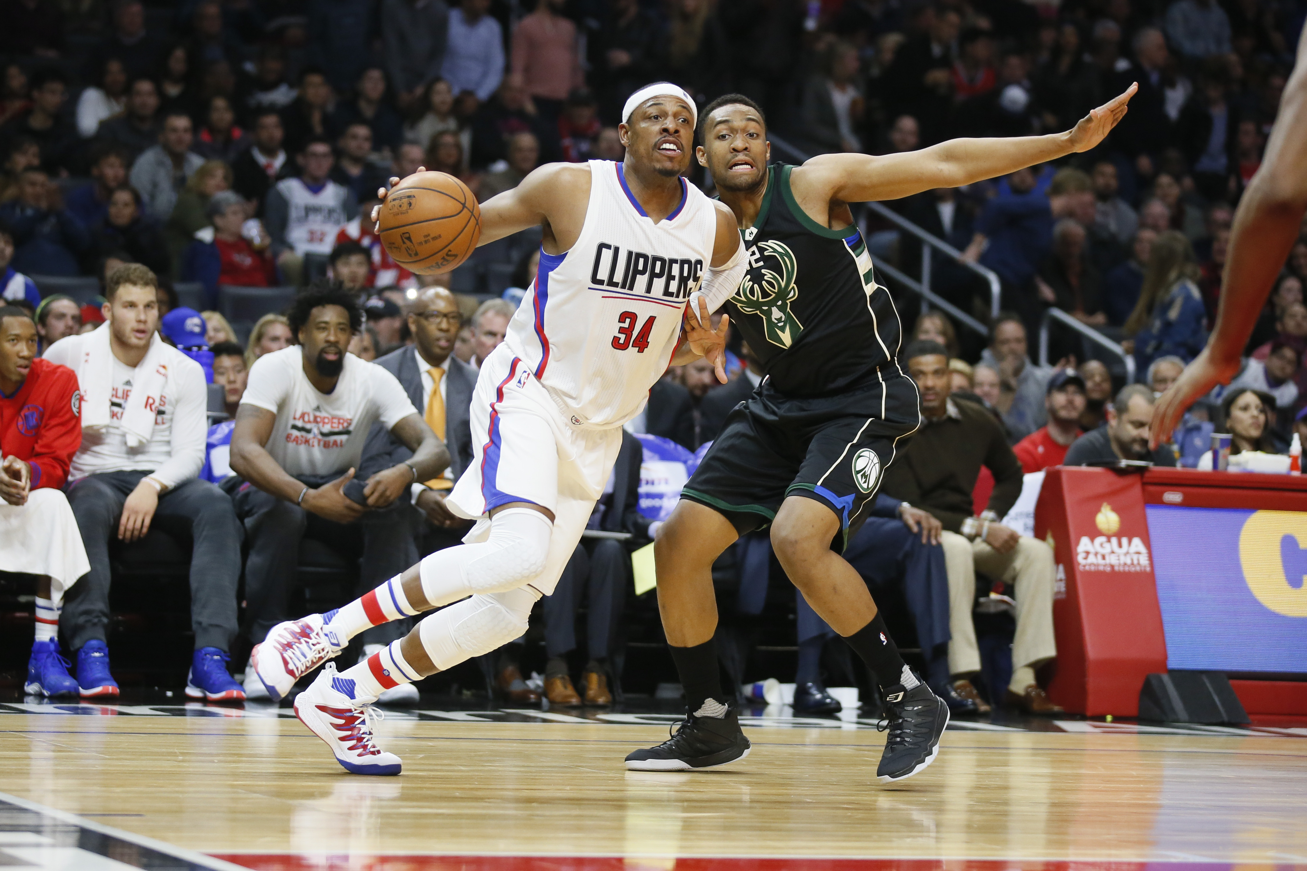 Los Angeles Clippers' Paul Pierce, left, dribble against Milwaukee Bucks' Jabari Parker during the first half of an NBA basketball game, Wednesday, Dec. 16, 2015, in Los Angeles. (AP Photo/Danny Moloshok)