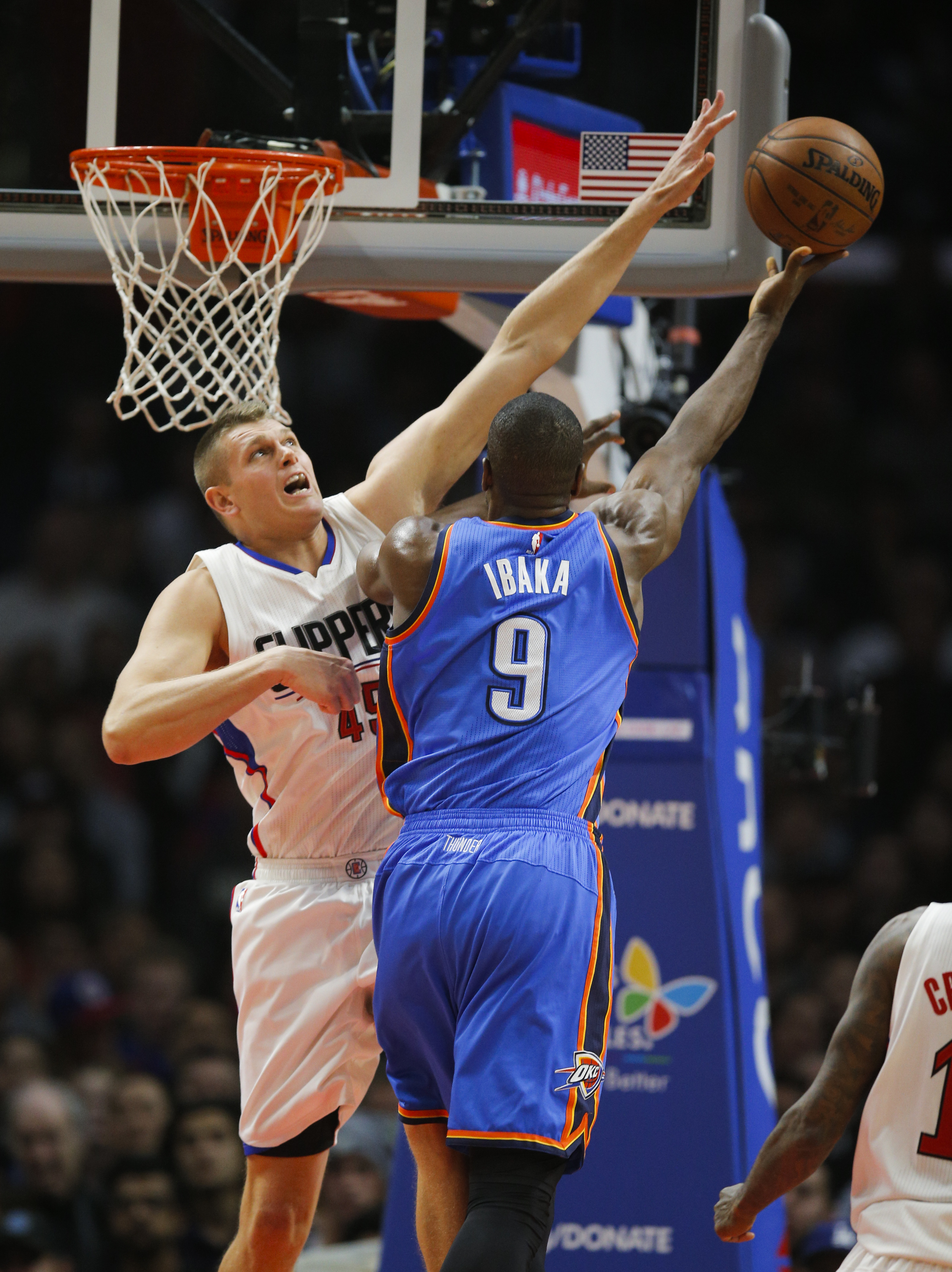 Los Angeles Clippers' Cole Aldrich, left, defends Oklahoma City Thunder's Serge Ibaka during the first half of an NBA basketball game, Monday, Dec. 21, 2015, in Los Angeles. (AP Photo/Jae C. Hong)