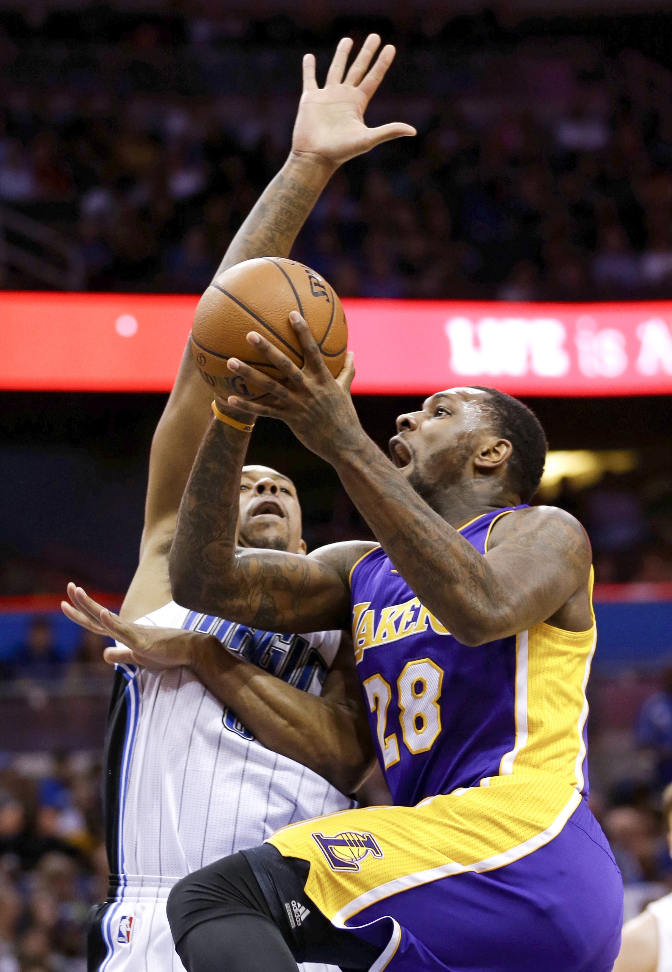 Los Angeles Lakers center Tarik Black (28) goes to the basket past Orlando Magic forward Channing Frye during the first half of an NBA basketball game, Wednesday, Nov. 11, 2015, in Orlando, Fla. (AP Photo/John Raoux)