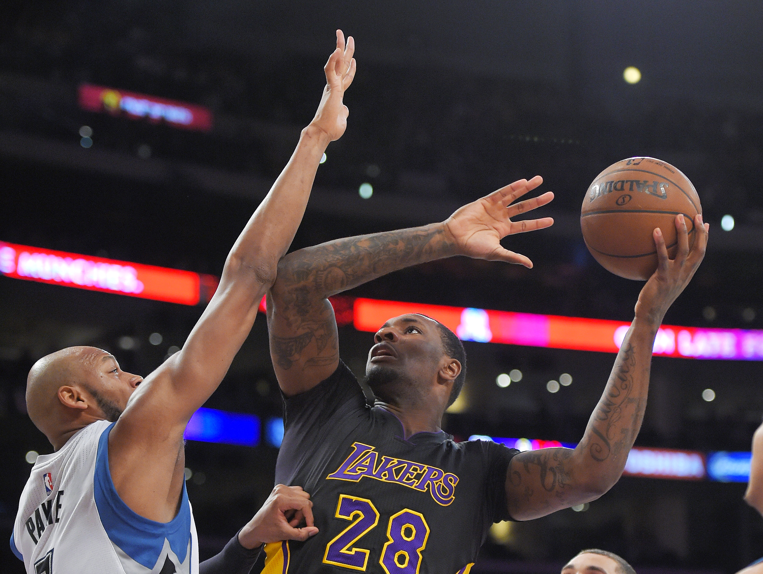 Los Angeles Lakers forward Tarik Black, right, shoots as Minnesota Timberwolves forward Adreian Payne defends during the first half of an NBA basketball game, Friday, April 10, 2015, in Los Angeles. (AP Photo/Mark J. Terrill)