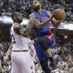 Detroit Pistons' Marcus Morris, right, drives past Cleveland Cavaliers' LeBron James in the second half in Game 2 of a first-round NBA basketball playoff series, Wednesday, April 20, 2016, in Cleveland. The Cavaliers won 107-90. (AP Photo/Tony Dejak)