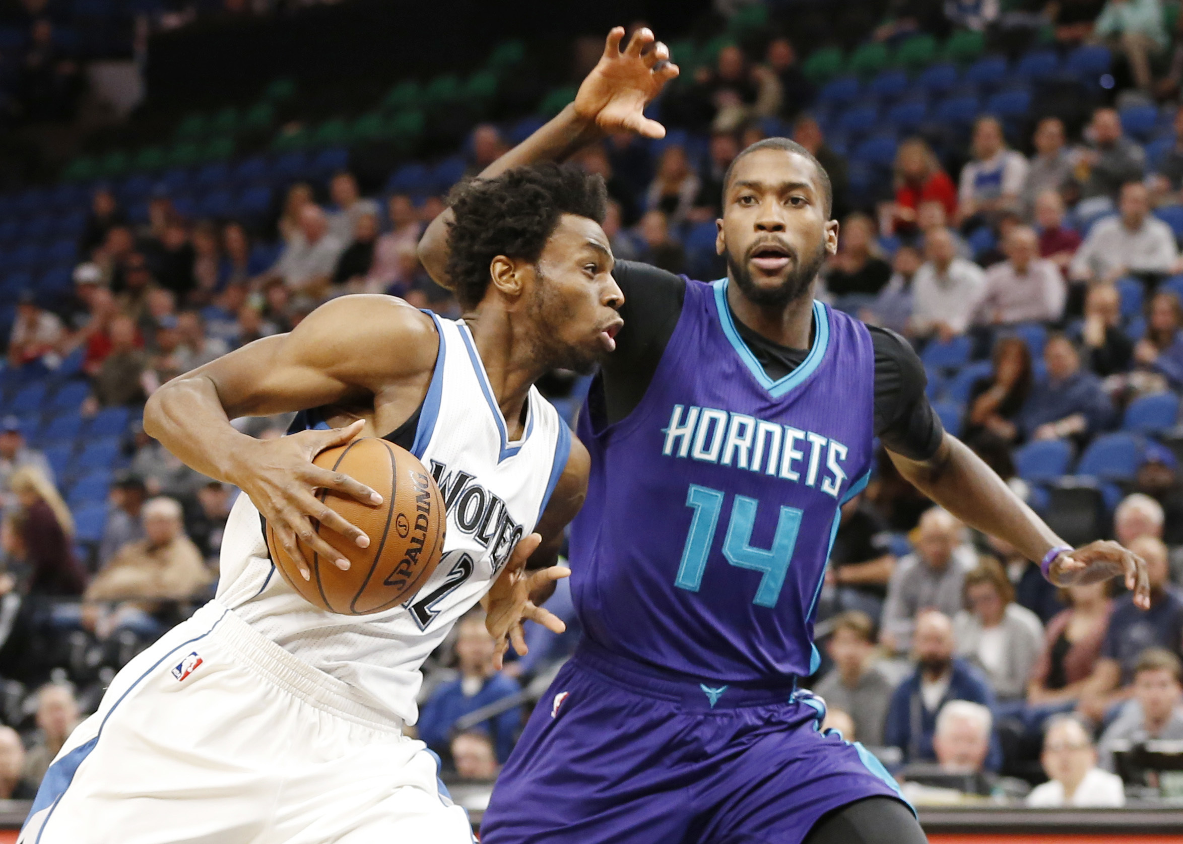 Minnesota Timberwolves' Andrew Wiggins, left, drives on Charlotte Hornets' Michael Kidd-Gilchrist in the first quarter of an NBA basketball game Tuesday, Nov. 15, 2016, in Minneapolis. (AP Photo/Jim Mone)