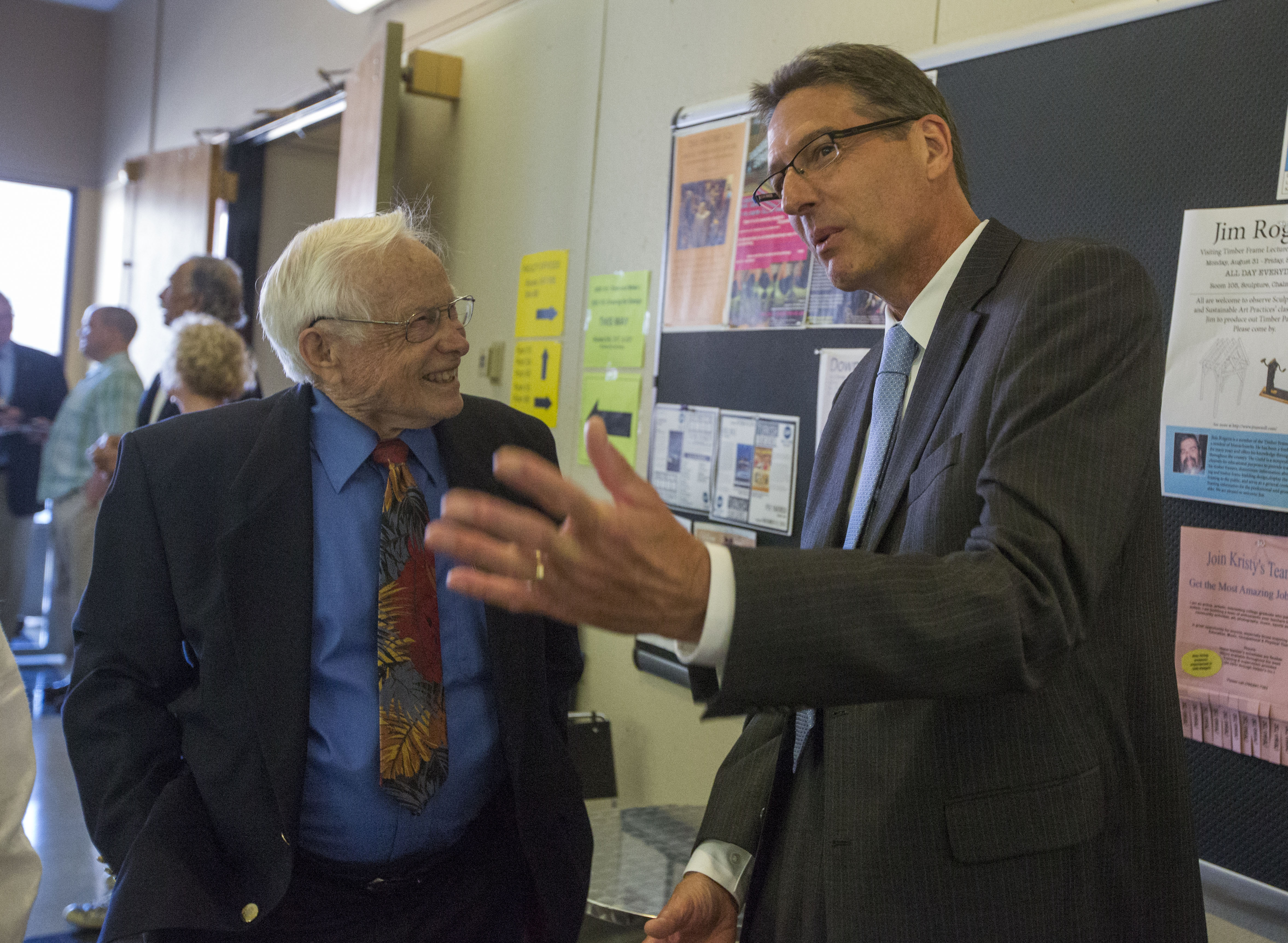 Thomas Chalmers, right, and former KU chancellor Del Shankel reminisce about Thomas' father, former chancellor E. Laurence Chalmers during a reception held Sunday afternoon in Chalmers Hall following a ceremony in Marvin Hall in which the former Art and Design Building as renamed Chalmers Hall.