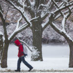 A Kansas University students makes the trek up to campus past a line of trees near Robinson Gymnasium on Thursday, Dec. 18, 2014 as the overnight snowfall blankets the trees and ground.