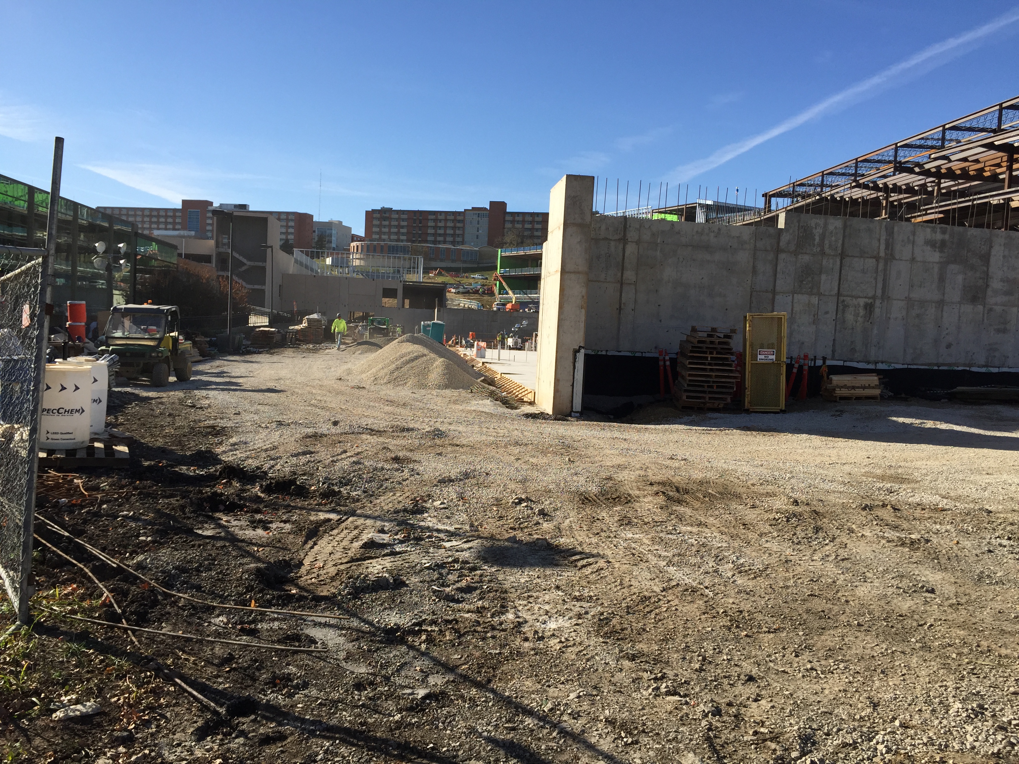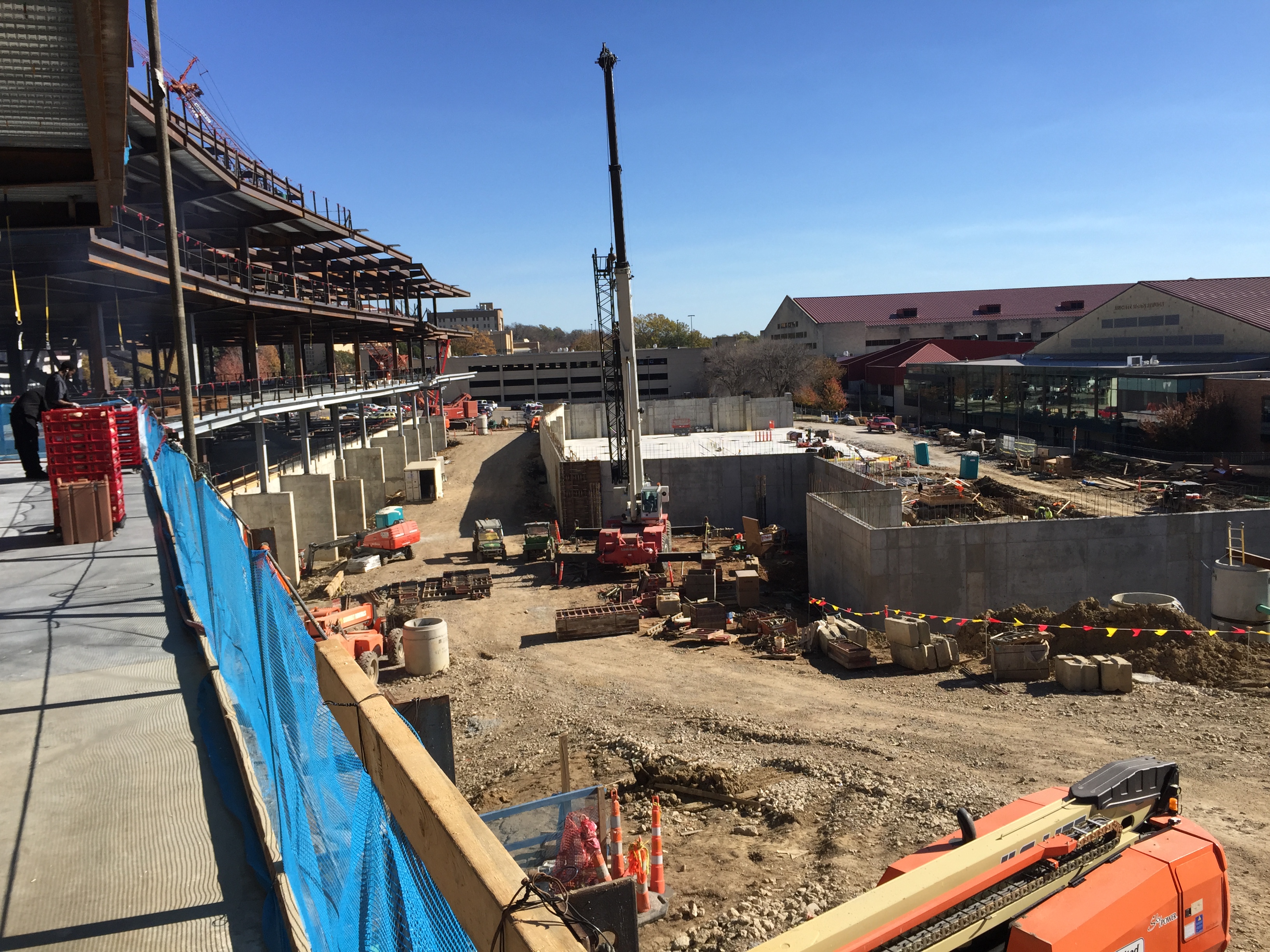 The new University of Kansas Central District student union foundation is seen from inside the under-construction Integrated Science Building on Nov. 9, 2016. The buildings lie in the area the Burge Union once stood.