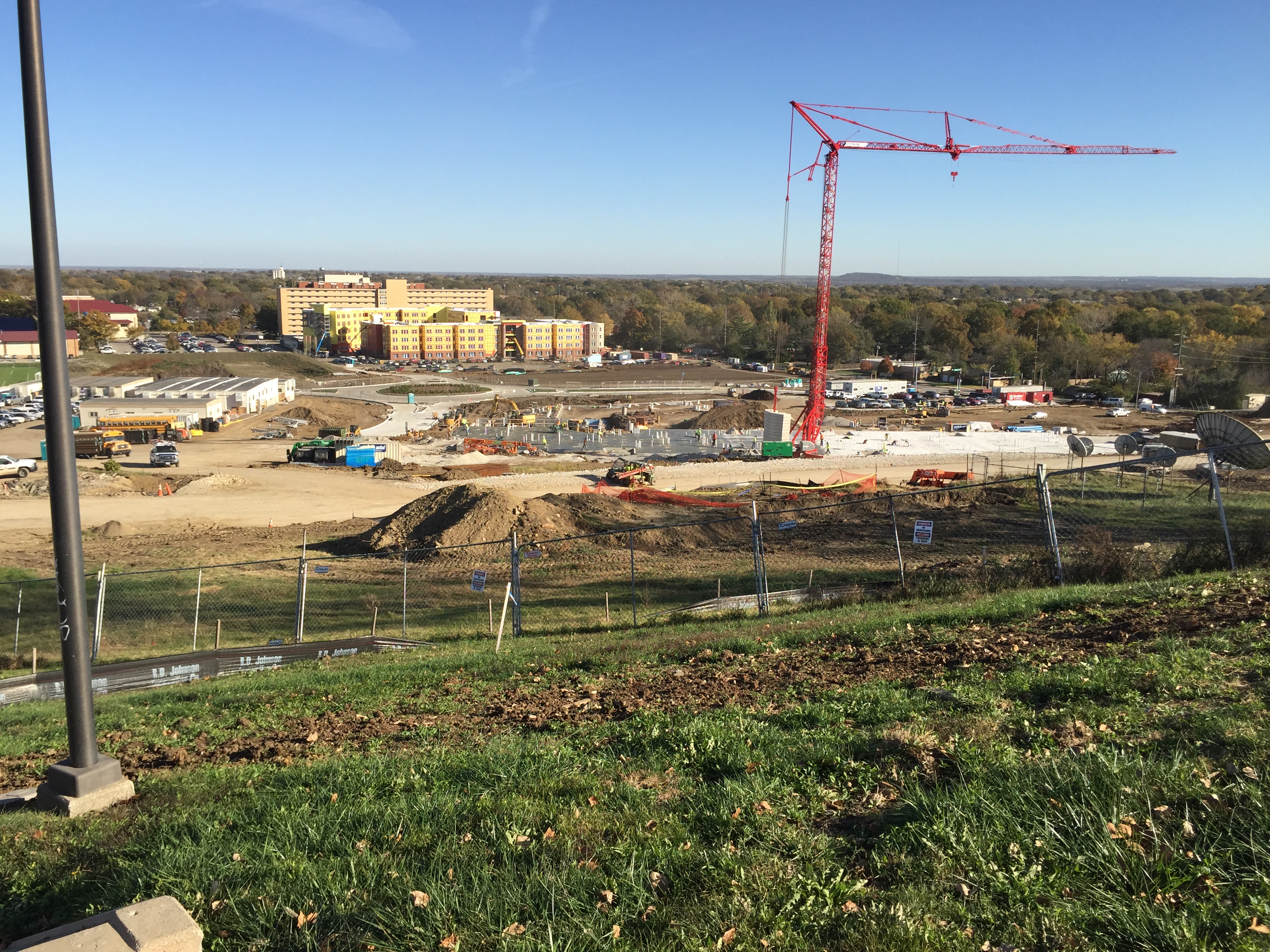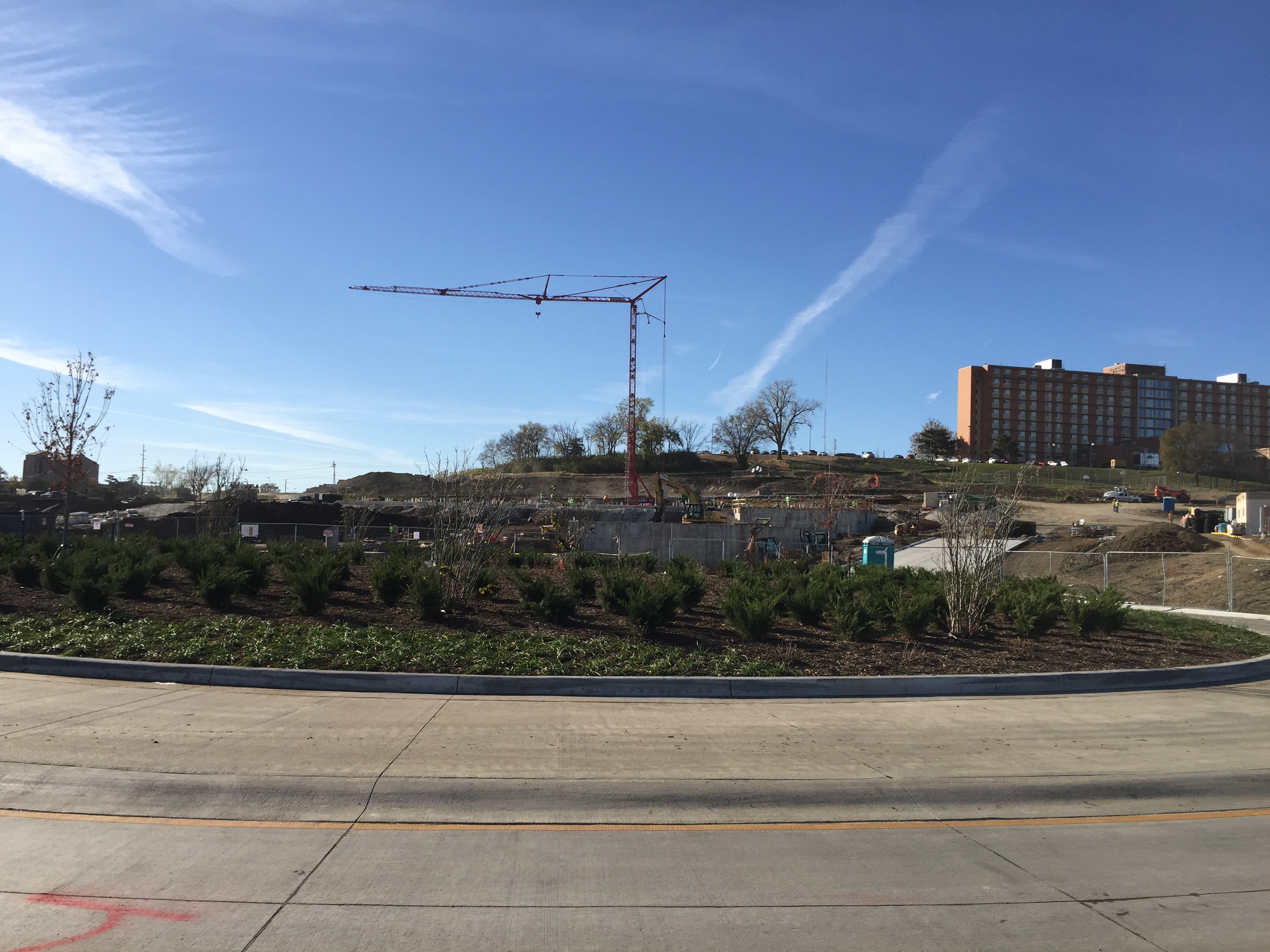 Thursday marked a milestone in the $350 million Central District redevelopment project at the University of Kansas. KU had a “topping out” ceremony for the new $117 million Integrated Science Building, considered a keystone of the entire district, in which the final beam was signed by stakeholders and hoisted by crane onto the building. With almost a year of construction in the area now completed, it seems like a good time for a photo update of how wildly different it looks already.