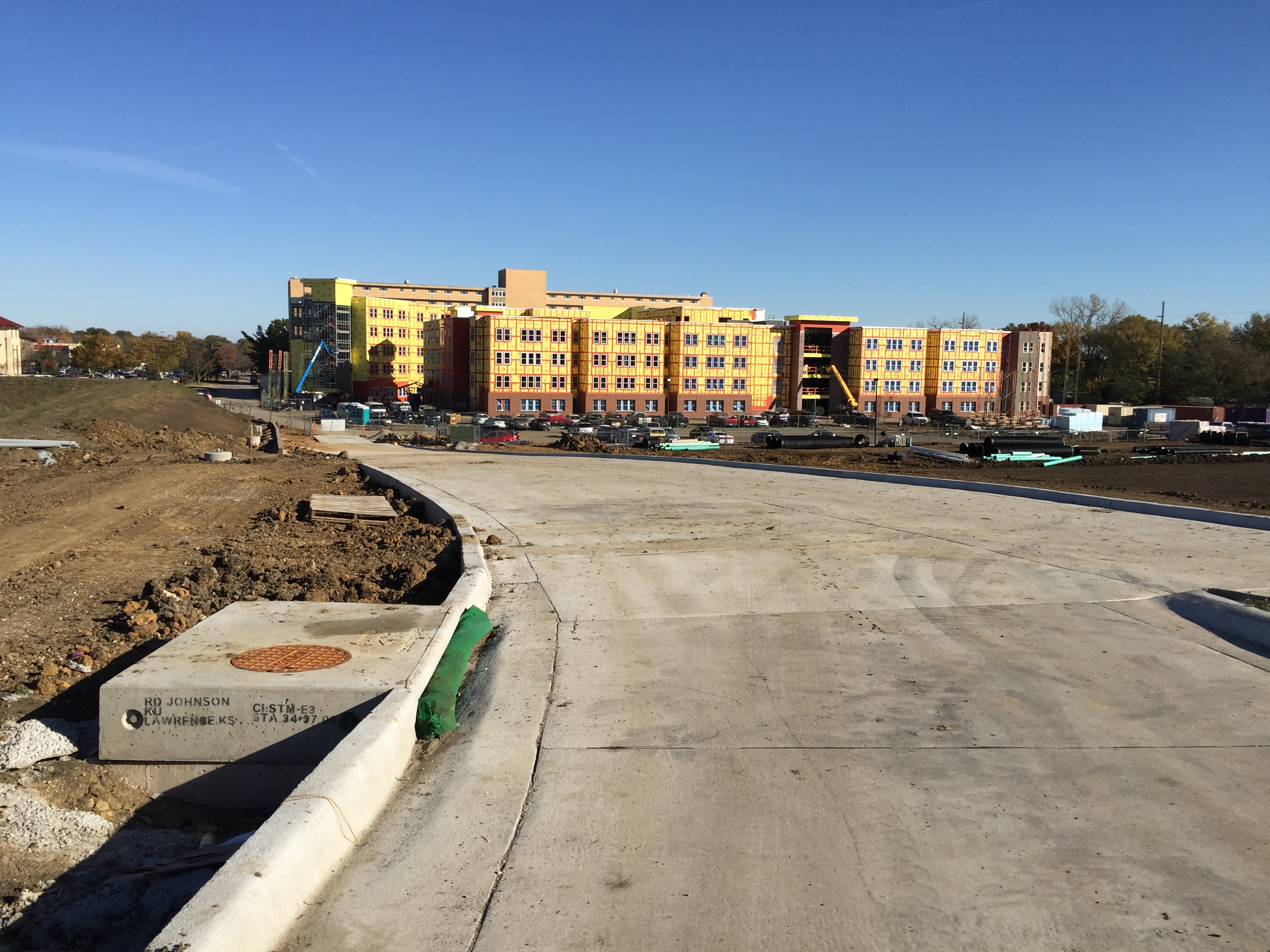A new traffic circle at the intersection of new extensions of 18th Street and Ousdahl Road is pictured in front of early construction work on a new student apartment complex just west of the intersection on Nov. 9, 2016. Projects are part of the 50 million Central District redevelopment project at the University of Kansas.
