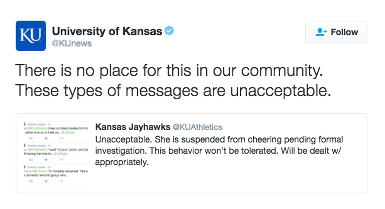 Tweets from the official University of Kansas and KU Athletics Twitter accounts are shown from Nov. 21, 2016. A KU cheerleader has been suspended from cheering after a photo was posted on her Snapchat account linking the Ku Klux Klan with President-elect Donald Trump.