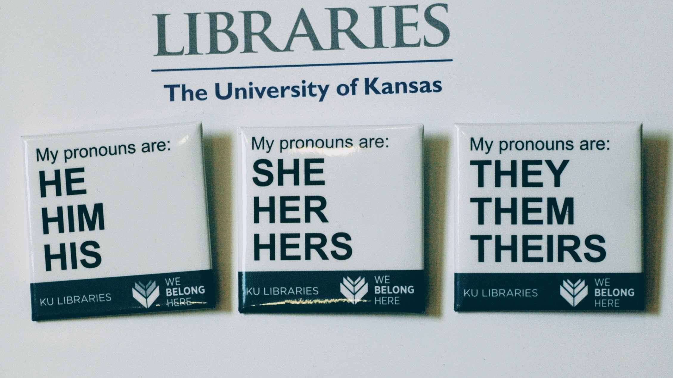 Buttons featuring preferred gender pronouns are part of the University of Kansas Libraries “You Belong Here” marketing campaign, targeted at attracting undergraduates and making sure they feel welcome, including those who are transgendered. The buttons are worn by library employees who wish to.
