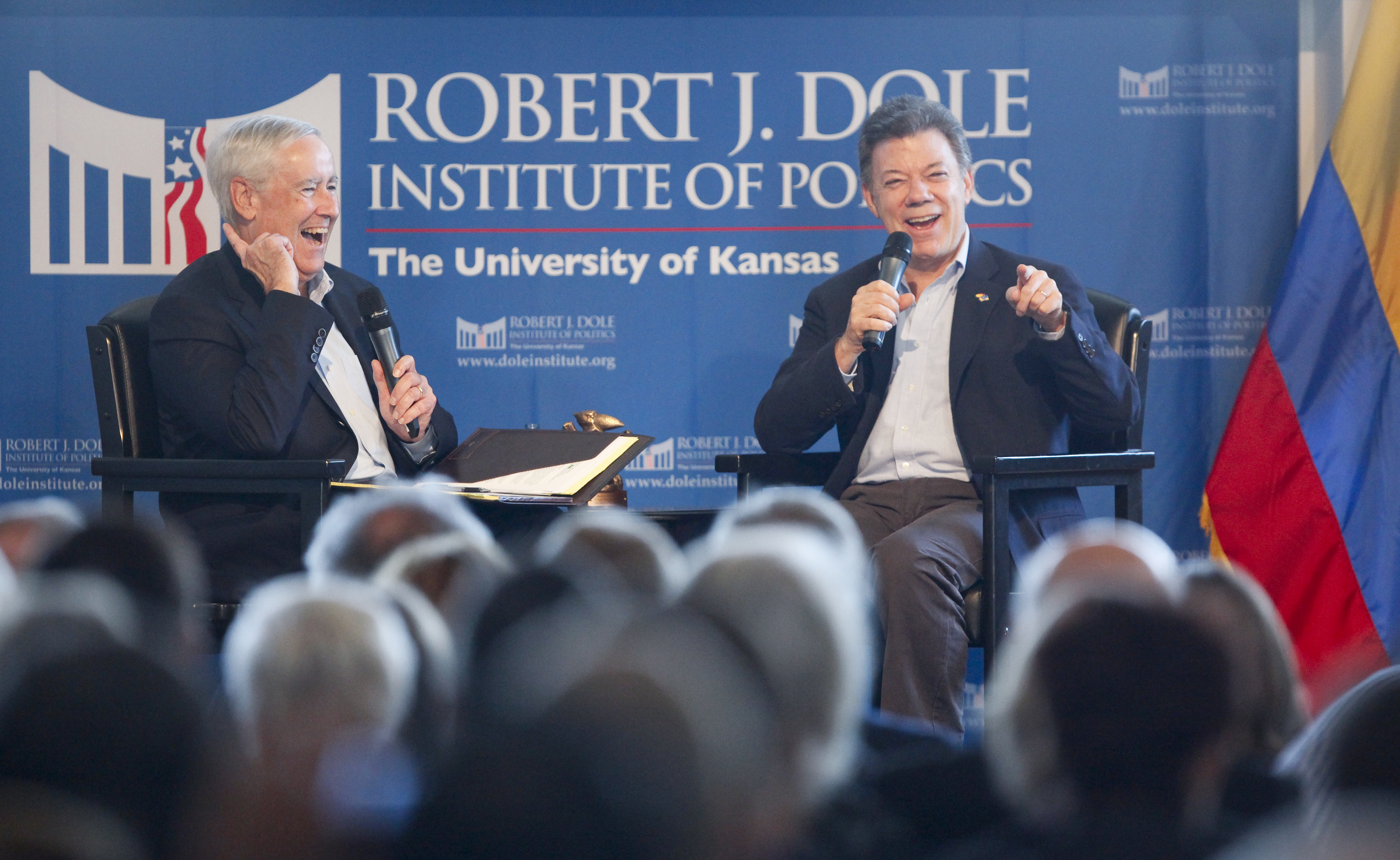 Colombian president Juan Manuel Santos, right, laughs alongside Bill Lacy, director of the Dole Institute of Politics, as Santos recounts a story Monday from his days as an undergraduate at Kansas University. Santos, a 1973 graduate of KU, was in Lawrence to receive the Alumni Distinguished Achievement Award.